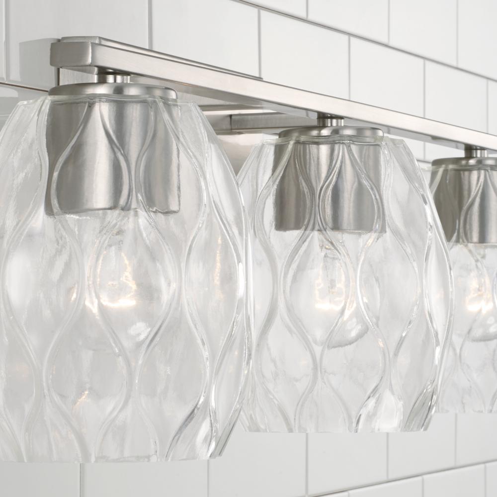 Simple shapes create a stunning statement with the Lucas 3-Light Vanity. The Brushed Nickel finish paired with the wavy, embossed pattern in the glass adds subtle dimension with intriguing illumination. Also available in a 2-Light or 4-Light.