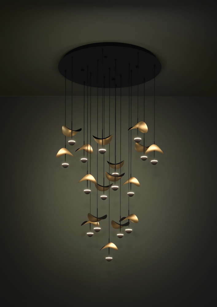 The DRACERA cascade 17-Light pendant features an elegant design using a round black canopy to anchor a series of slender cables, each on drops to a slender aluminum pringle shaped shade & under the shades sit integrated LED lights set within a conical housing at differing heights.