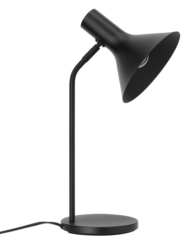 The MORESCANA table lamp has a conical metal shade in a trendy black finish. The shade is combined with a delicate black steel body and a round metal base. Showcasing a New Nordic design, the minimalist table lamp blends seamlessly into modern interiors.