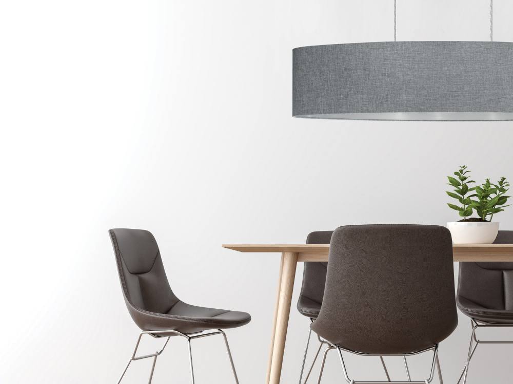 The MANDANA pendant features an oval shade made of gray fabric and a matte nickel metal suspension. The shade is combined with a silver-colored interior, skillfully rounding off the modern design. This pendant blends seamlessly into minimalist interiors and offers cozy lighting for any room—whether in the living room, bedroom, or in the dining room above the dining table.