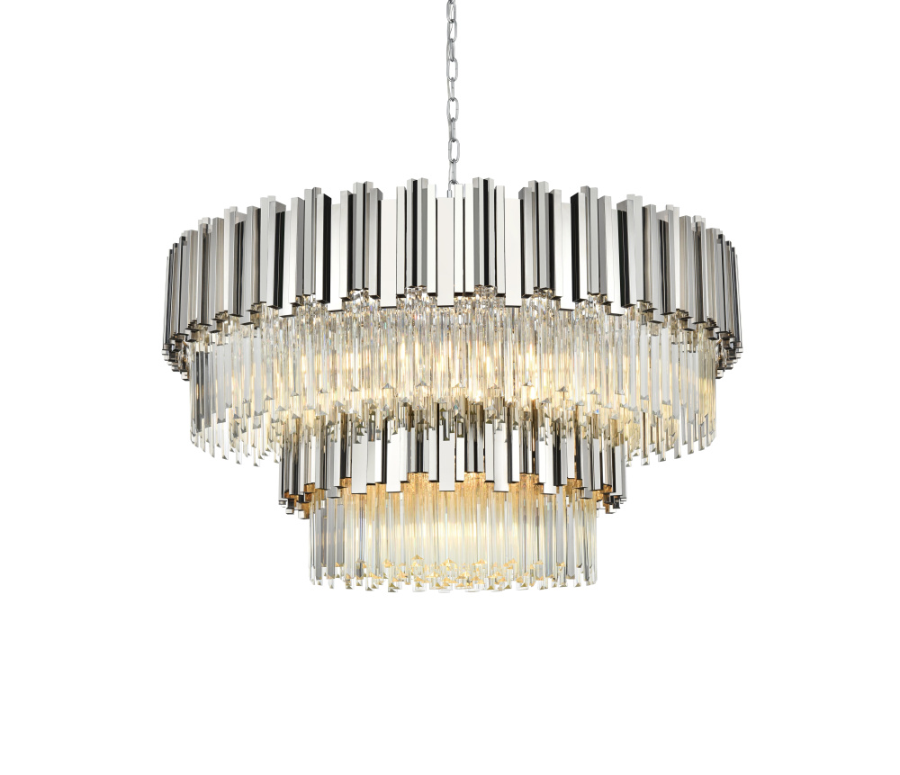 Transform your space with this stunning chandelier, a dynamic fusion of iron and staggered clear glass that exudes contemporary style and architectural artistry. The layered glass refracts light beautifully, creating a radiant display of glowing brilliance that fills the room with warmth and sophistication. The staggered arrangement of the metal and glass adds depth and dimension, making this chandelier an eye-catching centerpiece. Fully dimmable, it allows you to adjust the ambiance to suit any mood, from bright and vibrant to soft and inviting. Available in satin gold for a warm, luxurious vibe, chrome for sleek modernity, and black for bold, dramatic contrast, this fixture comes in various sizes to perfectly complement any space. Complete with a matching canopy, it’s an ideal choice for dining rooms, living rooms, or offices. Add a touch of refined geometry to your décor and bask in the brilliance of this radiant desi