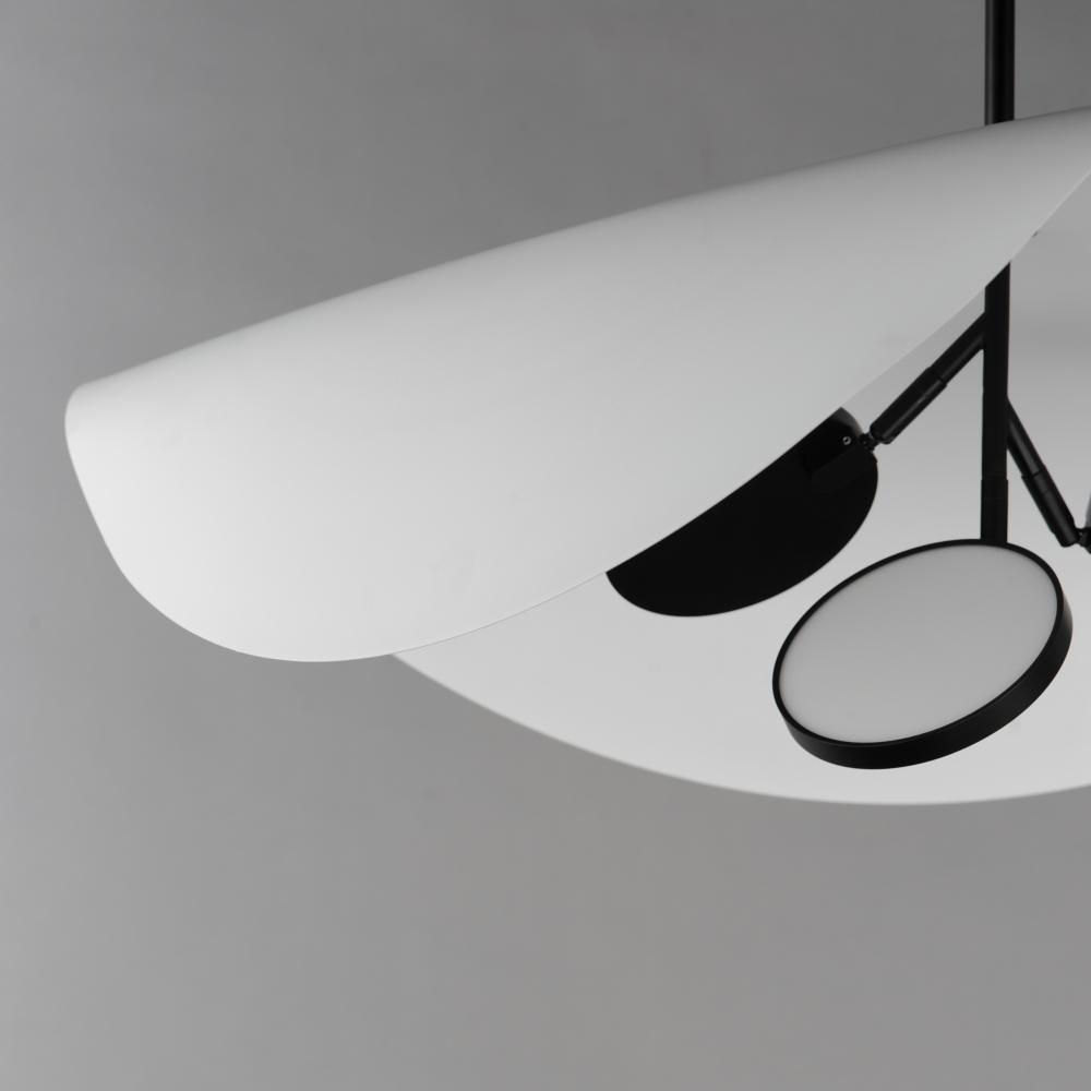 Poetic and organic in design, the undulating form of the metal shade appears to float effortlessly on a slender frame. Abstract discs of LED lighting are encased in round, adjustable heads so that the light can be directed upwards for indirect lighting ref