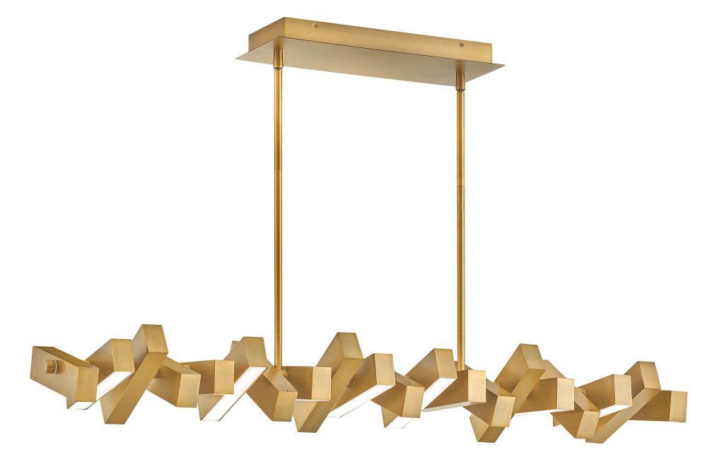 Stitch strikes a pose with an innovative design, offering bountiful illumination from articulating LED panels. This dynamic linear chandelier is a modern sculptural statement available in Painted Black Oxide or Lacquered Brass finishes.