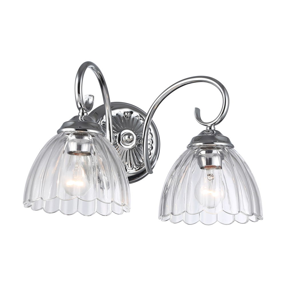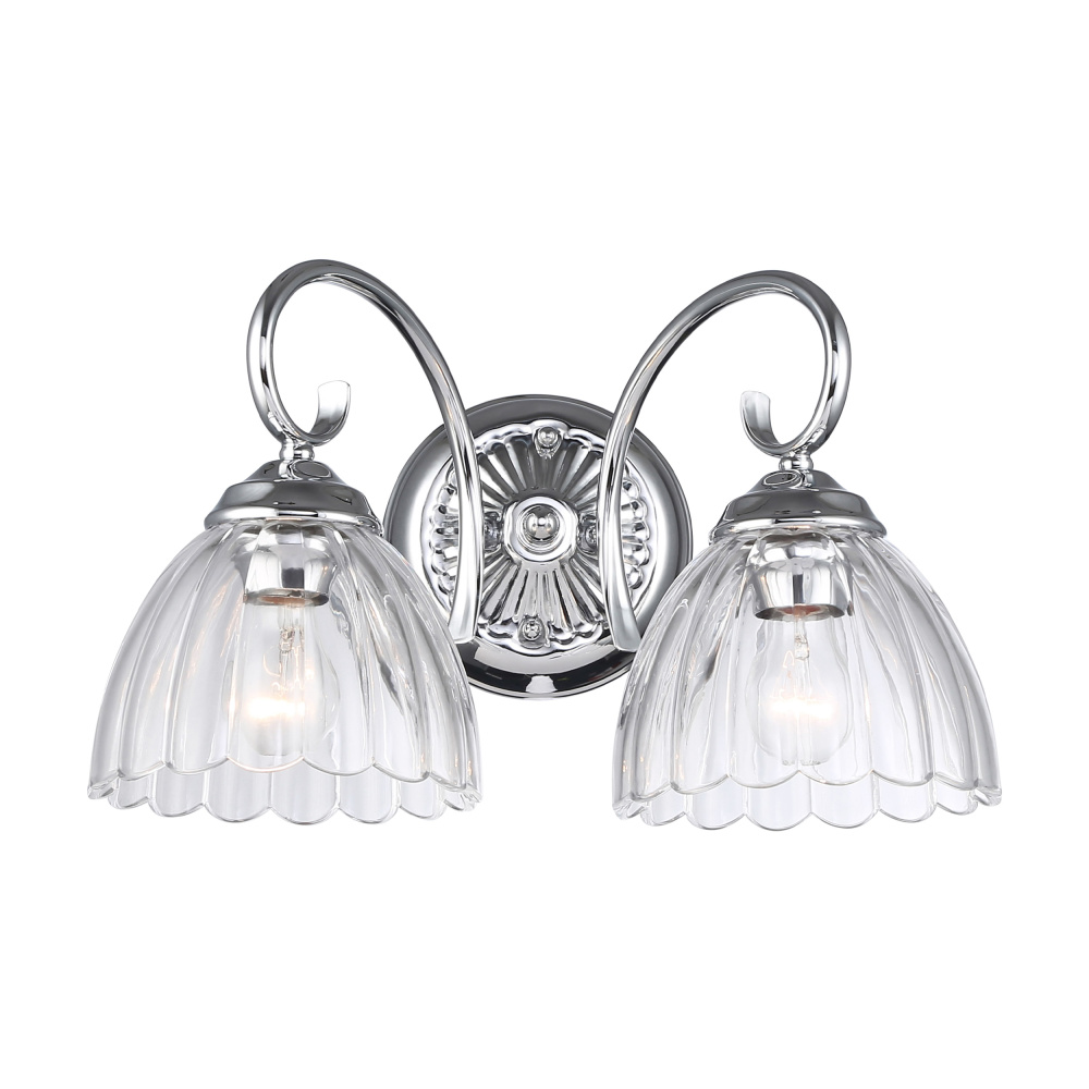 Bring glamorous elegance into your home with the Golden Lighting Audra 2-light Vanity. Featuring a glass shade and a polished Chrome frame, it creates a welcoming atmosphere. The clear glass shade offers brilliant, unobstructed light that illuminates your space beautifully. Brilliant and timeless, the Polished Chrome finish complements any décor style, offering a clean, sophisticated look. This vanity is damp location rated, suitable for bathrooms and covered spaces. Requires 2 E26 Medium base bulbs (not included), with a maximum wattage of 60 per bulb. Overall dimensions are 16"W x 9.63"H x 9.5"D. Elevate your bathroom with this sophisticated fixture that combines functionality and luxe appeal.