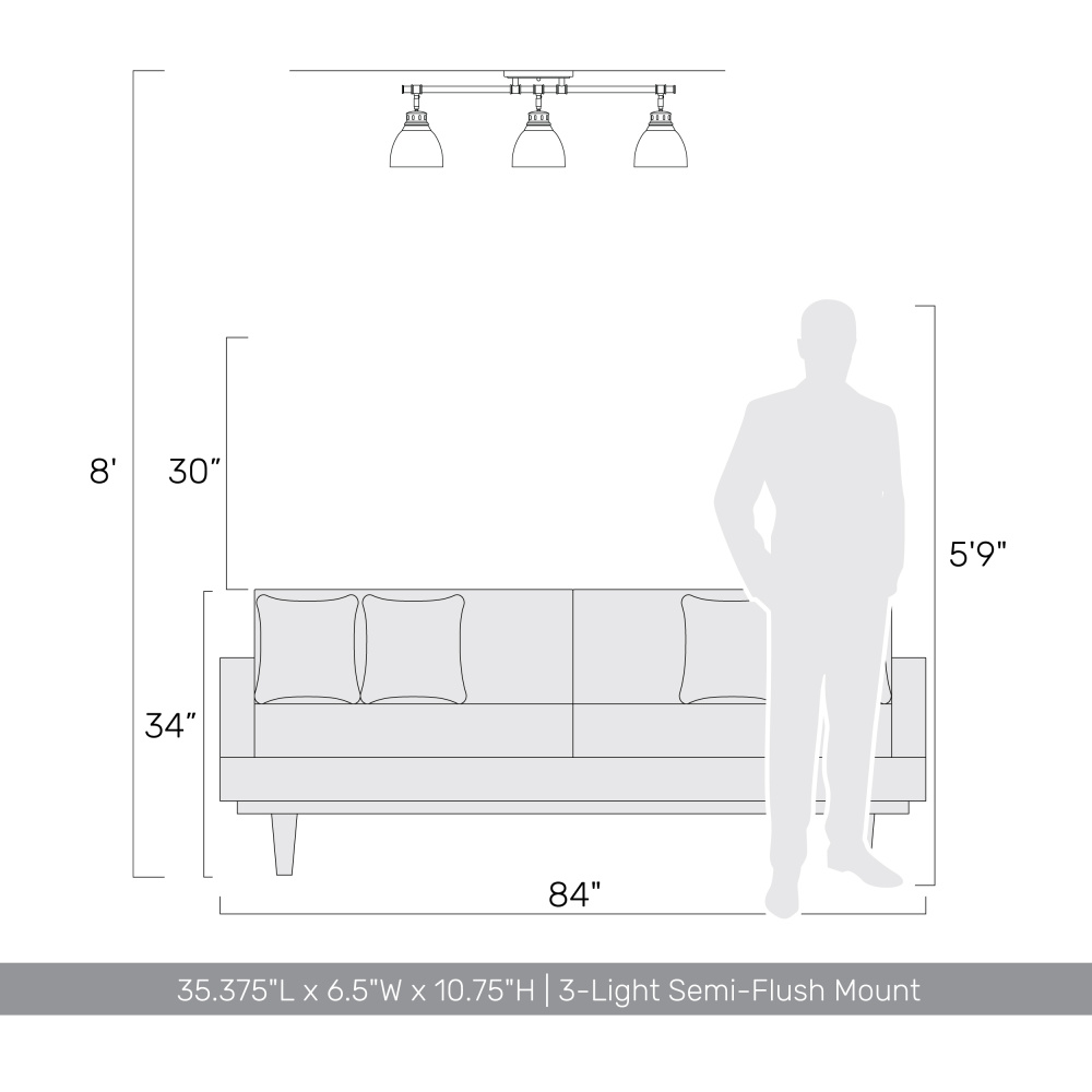 Bring farmhouse elegance into your home with the Yep by Golden Lighting Duncan 3-light Semi-Flush Mount. Featuring a metal shade and a matte black frame, it creates a welcoming atmosphere. The rubbed bronze metal shade showcases a rich brown finish with warm coppery highlights, adding depth and warmth to your decor. This finish is both clean and modern, its deep black hue is versatile and complements a wide range of styles. This fixture is damp rated, suitable for covered areas like bathrooms and porches. It features adjustable directional heads, allowing you to customize the lighting to highlight specific areas. The overall dimensions are 35.38"W x 10.75"H x 6.5"D, and it requires 3 E26 Medium base bulbs (not included) with a maximum of 100 watts per bulb. Elevate your home with quality craftsmanship and a charming design.