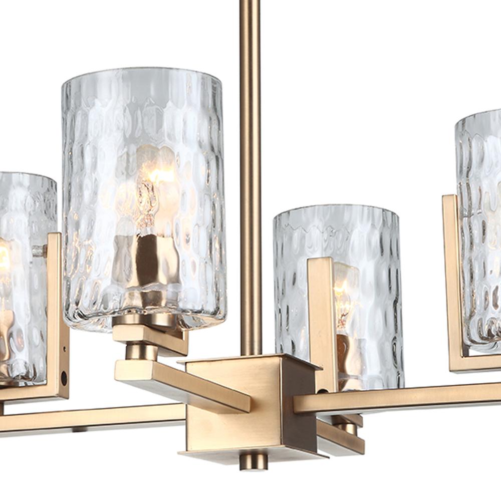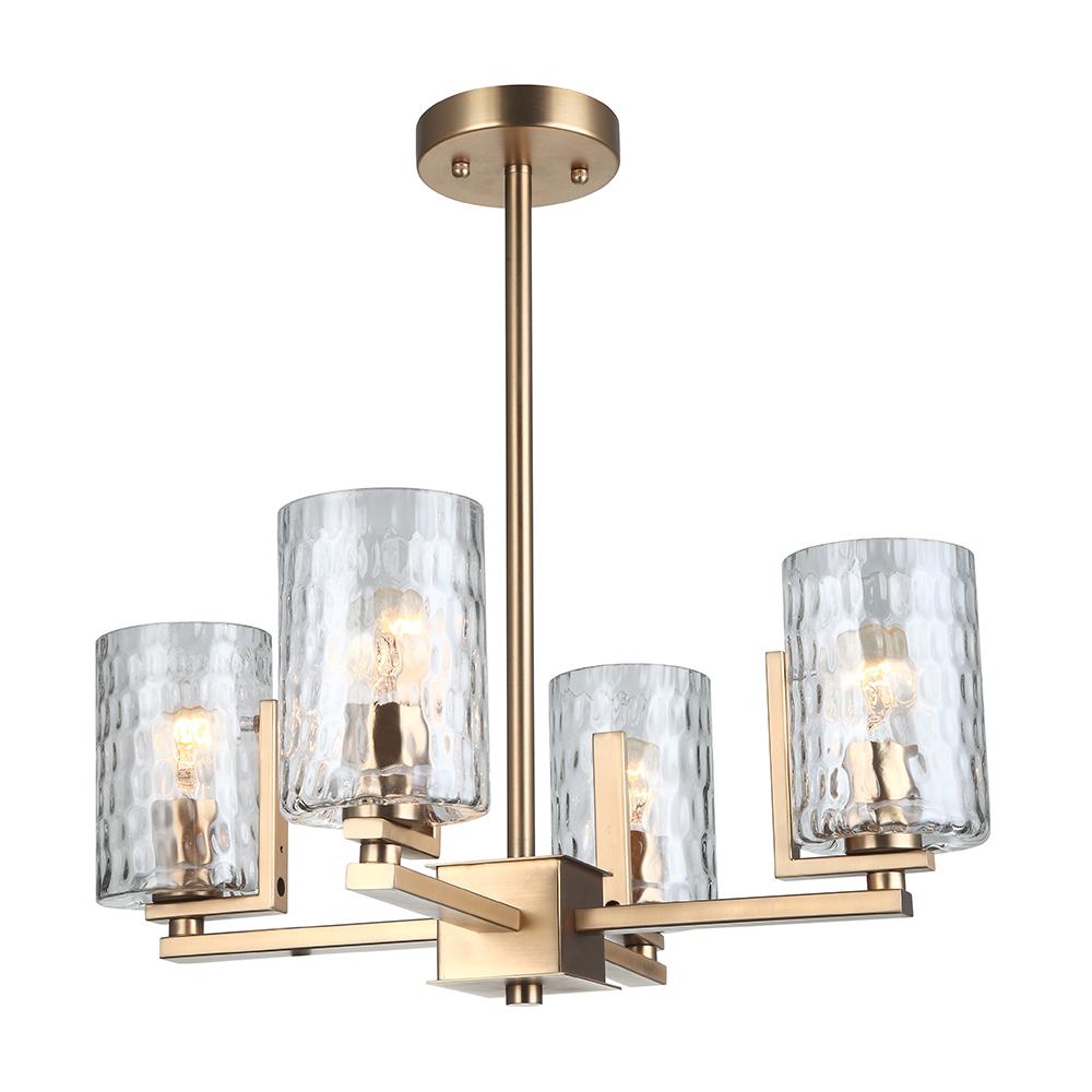 Chandelier, 4 Light with Cylinder Clear Hammered Glass in Aged Brass Finish