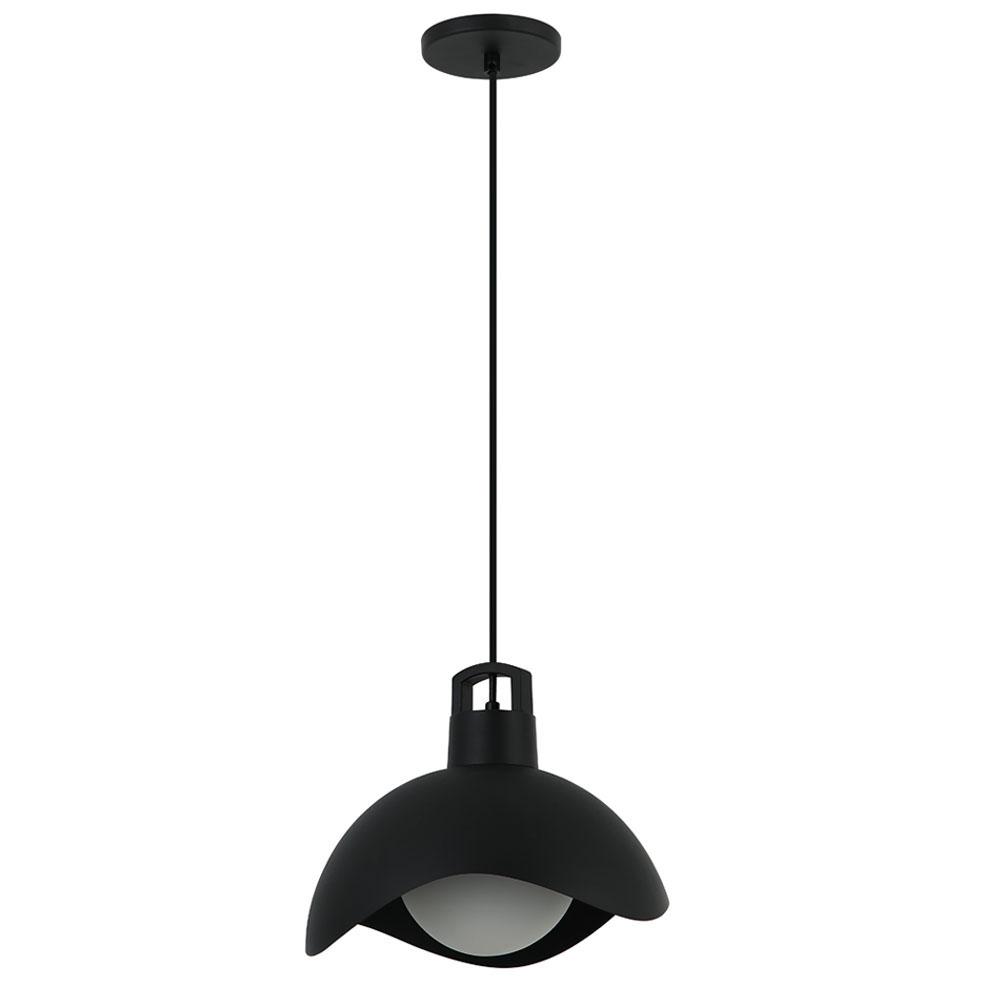 Metal Dome Pendant with Satin White Glass in Black Finish with Black Cloth Cord.