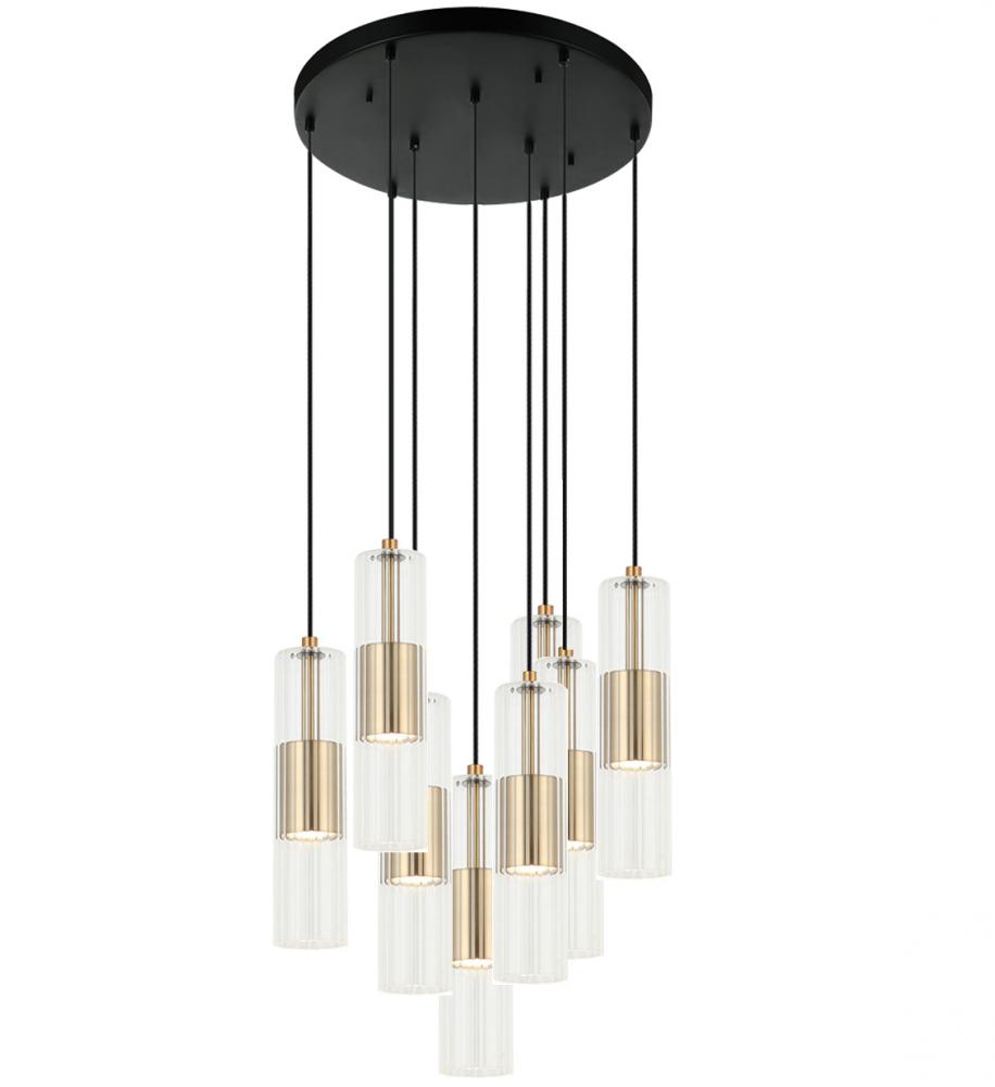 8 Light - 20" dia. Canopy - Black Cloth Cord Pendant with Clear Ribbed Cylinder Glass in Aged Brass Finish with a Black Canopy.