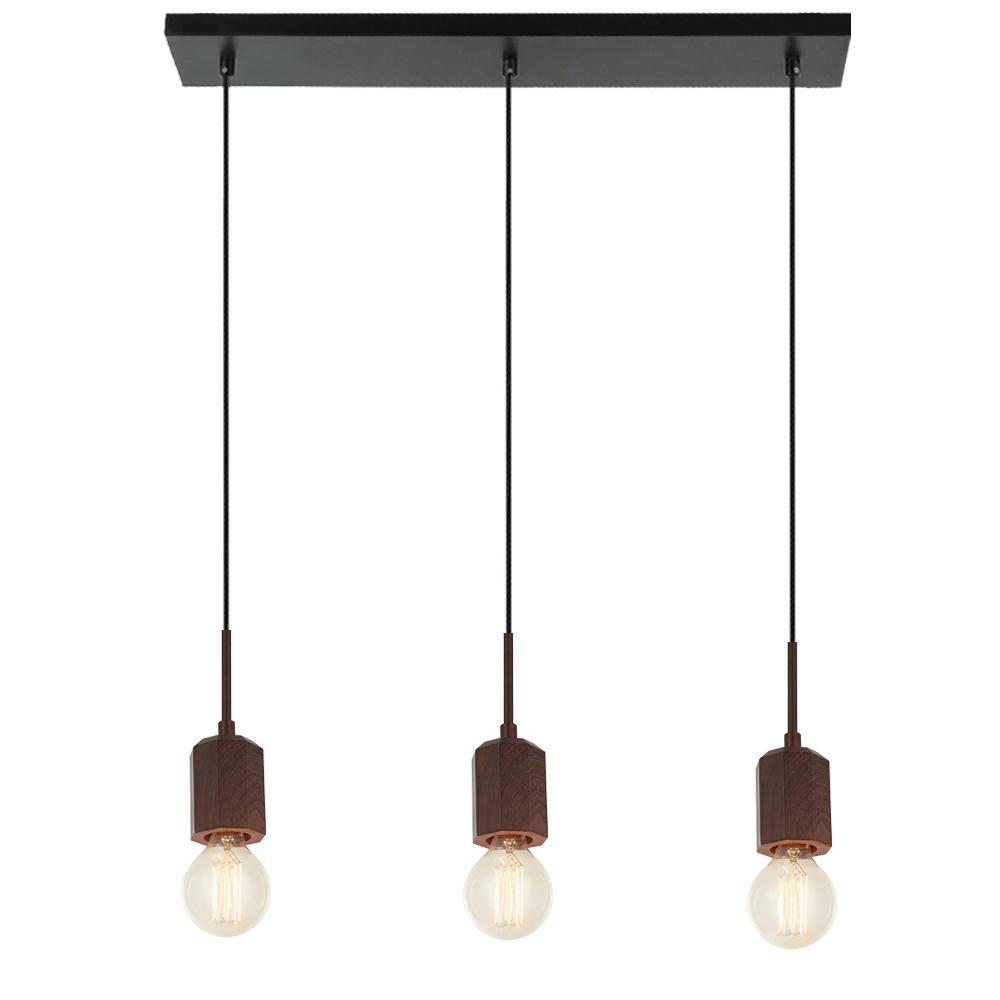 96" Cord - 3 Light Faux Walnut Wood Socket Cup with Black Cloth Cord on a 24" Length Black Rectangle Canopy