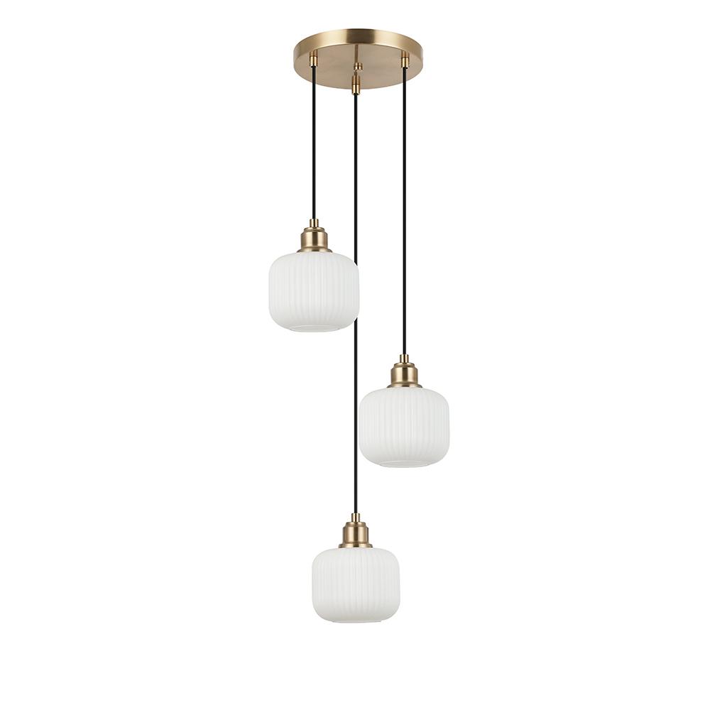10" dia. Canopy 3 Light Pendant features a Ribbed Satin White glass shade, Champagne Bronze Hardware & Cord suspension.