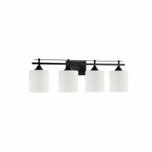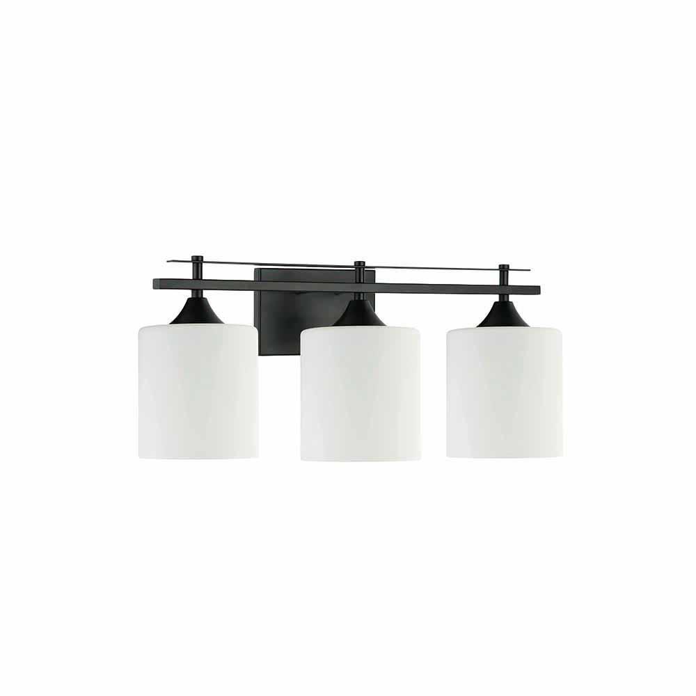 3-Light Vanity Light with White glass shades in Black Finish, can be installed up or down.