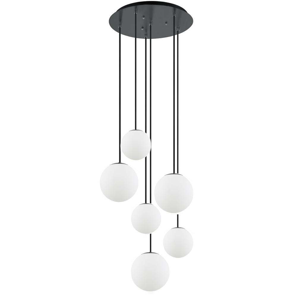 6 Light Pendant with 8" & 6" diameter Satin White Acrylic Globe in Black Finish with 8' Cord on a 20" dia. Canopy.