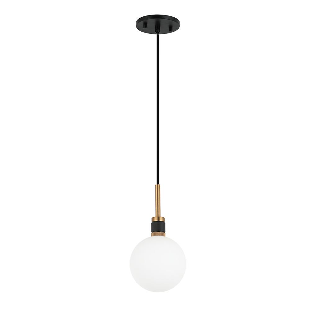 Pendant with 4.75" dia. White Globe Glass in a Black/Aged Brass finish with 96" Black Cloth Cord. Artisan Hand Blown Glass, each piece crafted with Care.