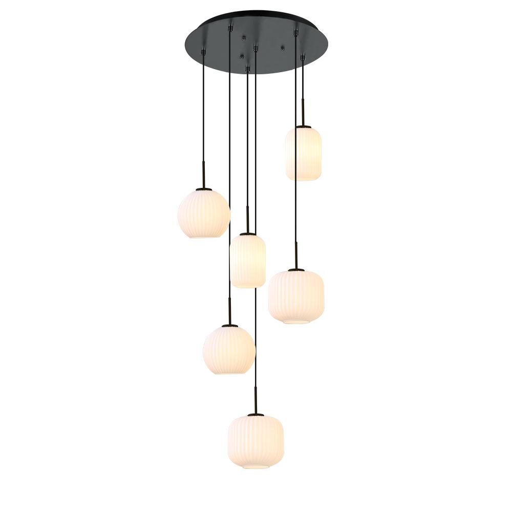 20" dia. Canopy - 6 Pendants with White Ribbed Cylinder, Drum & Globe Glass in Black Finish with Black Cord