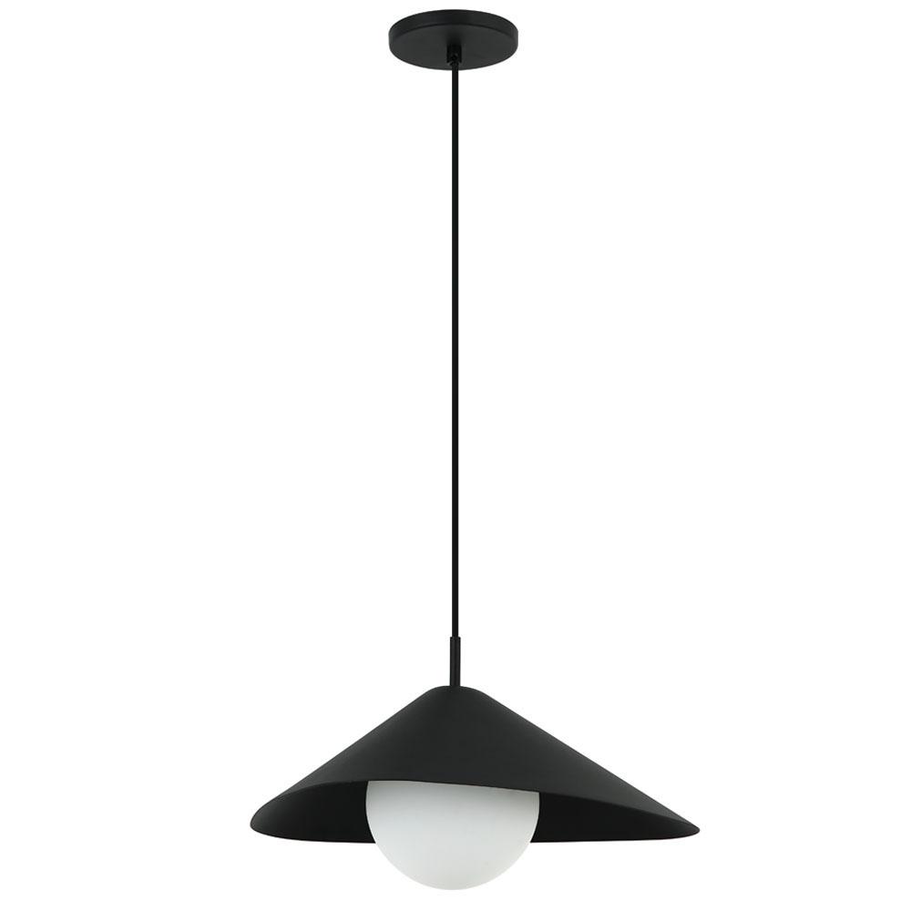 Metal Dome Pendant with Satin White Glass in Black Finish with Black Cloth Cord.