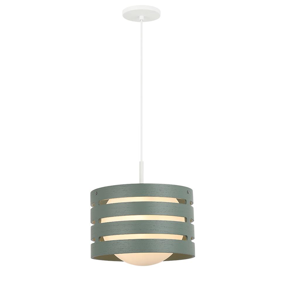 1 Light Pendant / Wood Drum Shade with Satin White Globe Shade in Lush Green Finish with White Vinyl Cord.