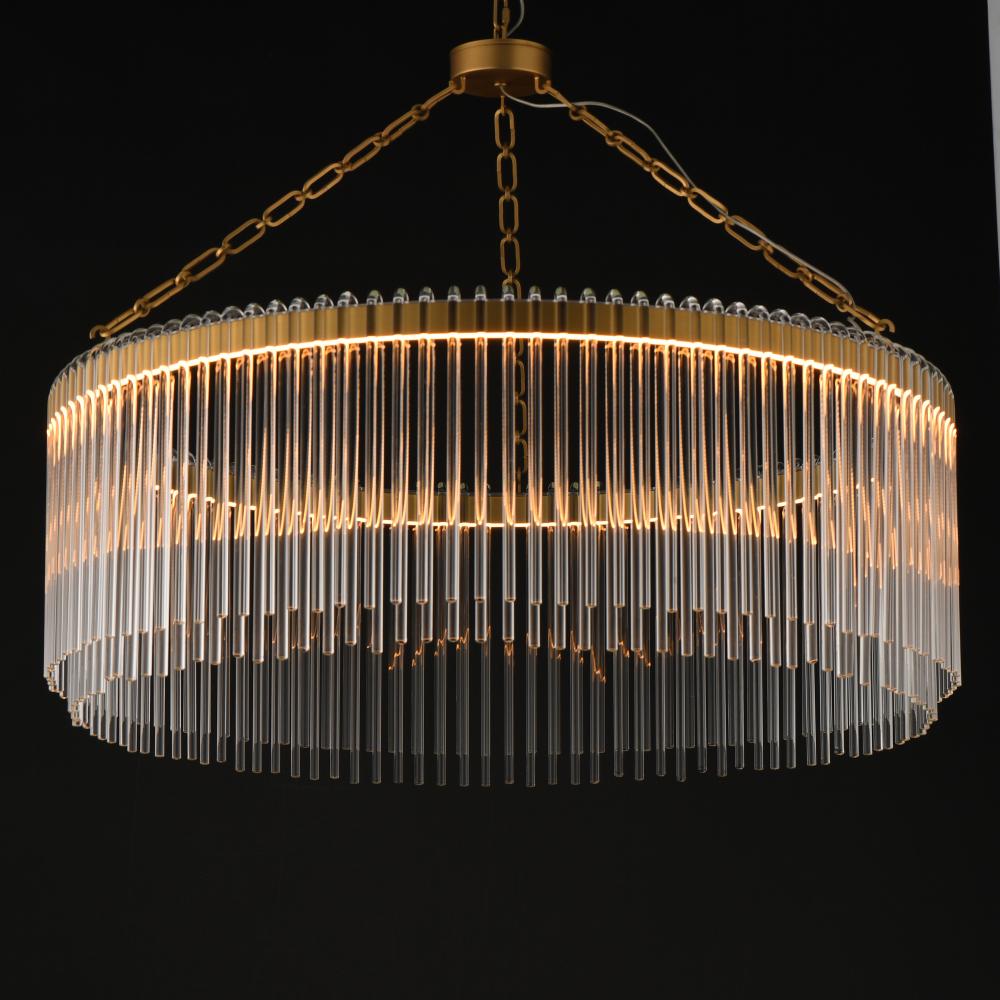 Clear glass rods elegantly curve to drape over a metal frame, encasing an integrated LED light source within. These ornamental glass rods form a luminous curtain, softly illuminated by the LEDs. The LED light source features an adjustable color temperature
