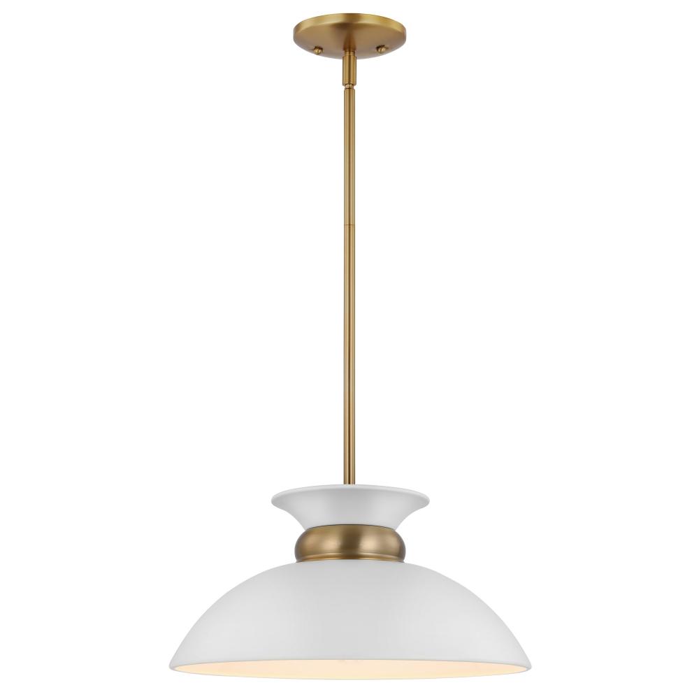 The simplistic design of the Perkins 60-7463 small pendant is understated, yet refined. The decorative burnished brass band on the shallow-dome metal shade cinches at the top, creating the illusion of a swirling skirt. The white interior of the shade provi