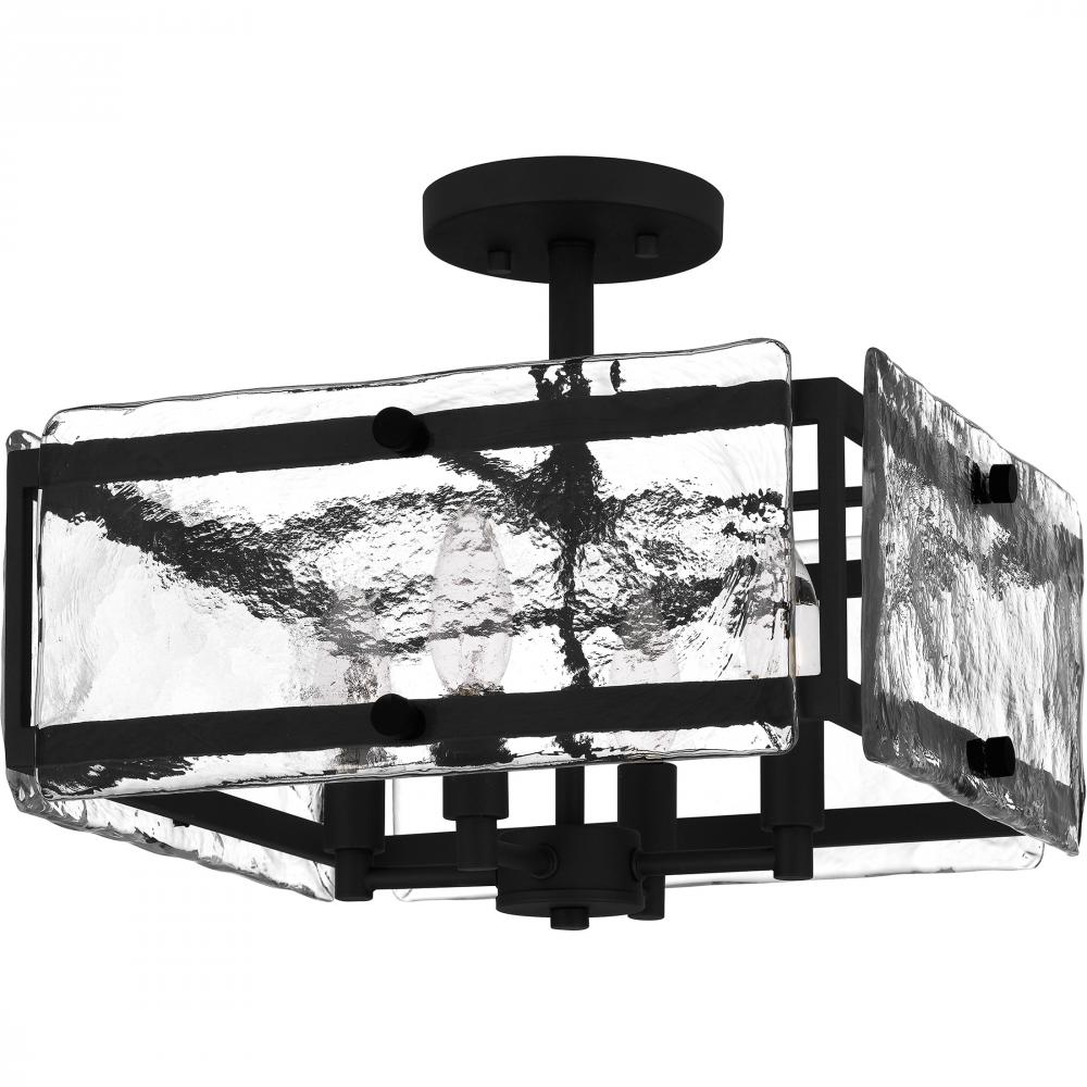 Coastal meets industrial. The Lancer semi-flush mount features a square silhouette with rectangular clear glass panels and round knob accent pieces. Choose from either matte black or mottled silver for a one-of-a-kind statement piece in any foyer, bathroom