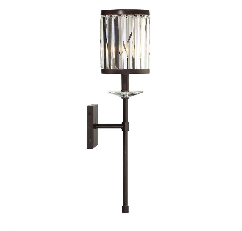 In the Savoy House Ashbourne, contemporary styling meets traditional materials for a wall sconce that’s right at home in your transitional or traditional decor. The light arm, wall plate and rims of the frame have a rich Mohican bronze finish. The frame is lined with beautiful rectangular clear crystals and there’s a decorative crystal just below the lamp too. One 60W candelabra size bulb within provides lovely illumination filtered through the crystals. The Ashbourne sconce is 6.5" wide, 26" high and extends 8" from the wall, making it a perfect size for your dining area, living room, entryway, great room, bedroom, bathroom, hallway, office, family room or stairway.