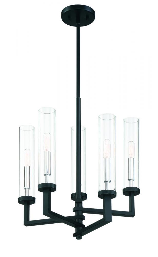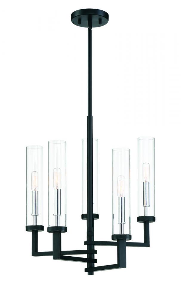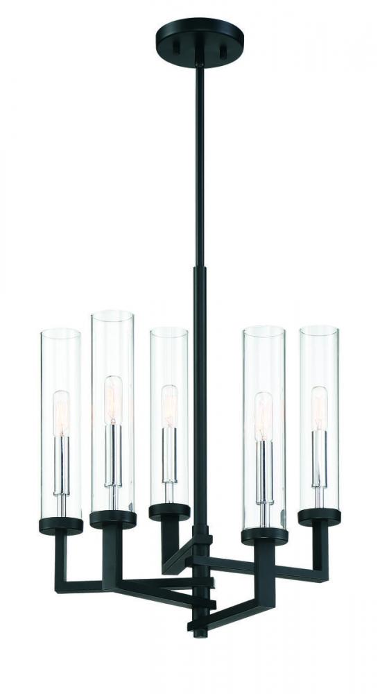 This Savoy House Folsom 5-light chandelier has a clean and versatile look that pairs well with so many decor styles! It features adjustable arms topped with slim tubular shades of clear glass and a bold two-tone finish of matte black with polished chrome. Folsom is 21" in height and 18" in width. It uses 5 candelabra size bulbs of up to 60 watts per bulb.