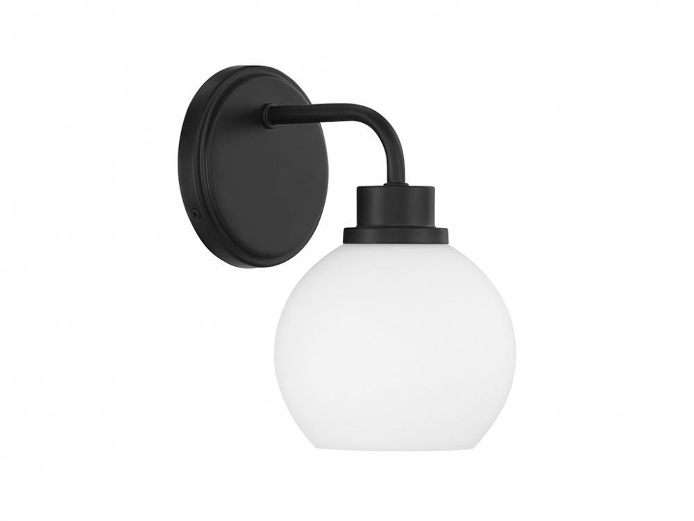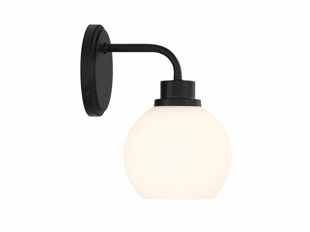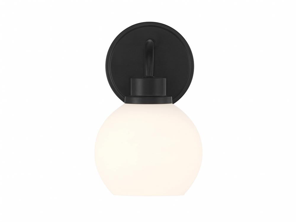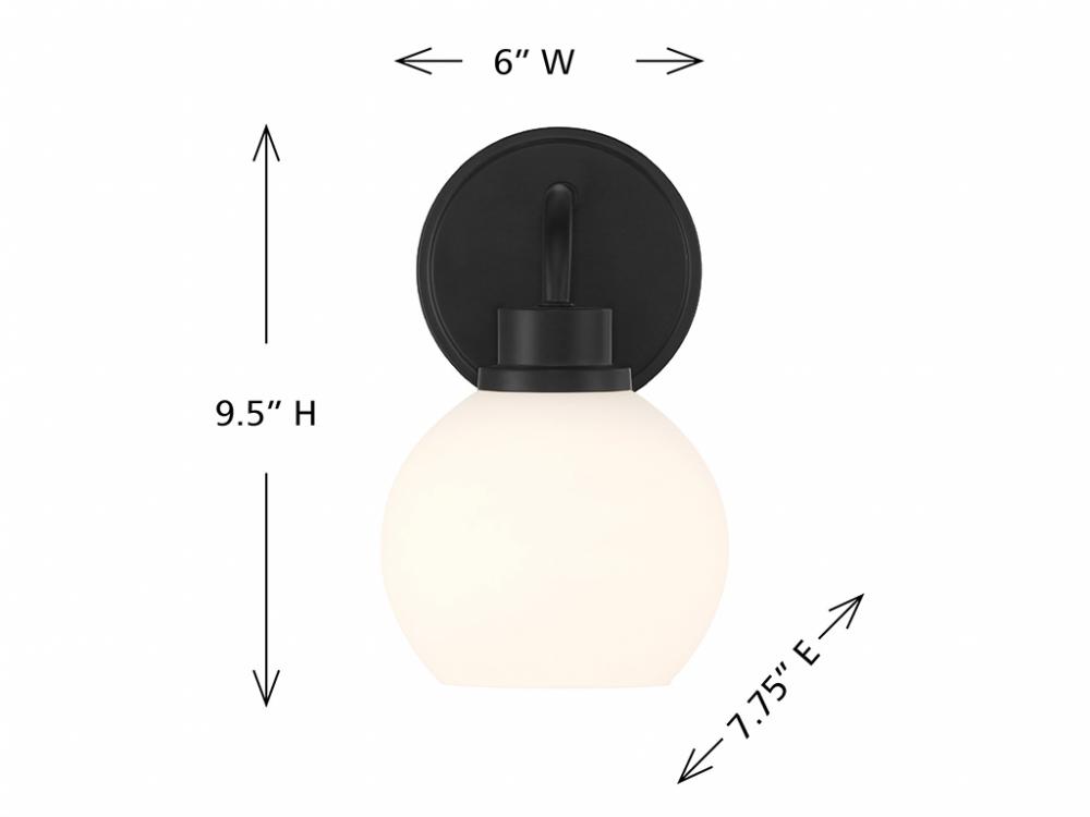 Freshen up your bathroom with the sleekly timeless style of this 1-light sconce, which features an orb-shaped shade of white opal glass that is open at the bottom and a versatile Matte Black finish. It is 9.5" in height, 6" in width and extends 7.75" from the wall. It uses 1 standard size bulb of up to 60 watts. Bulb not included.