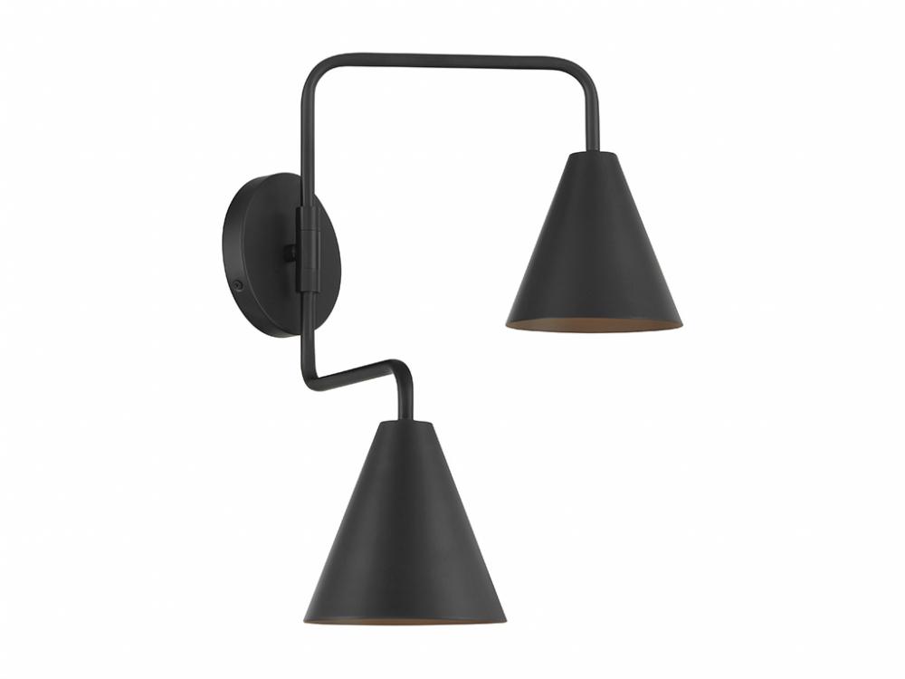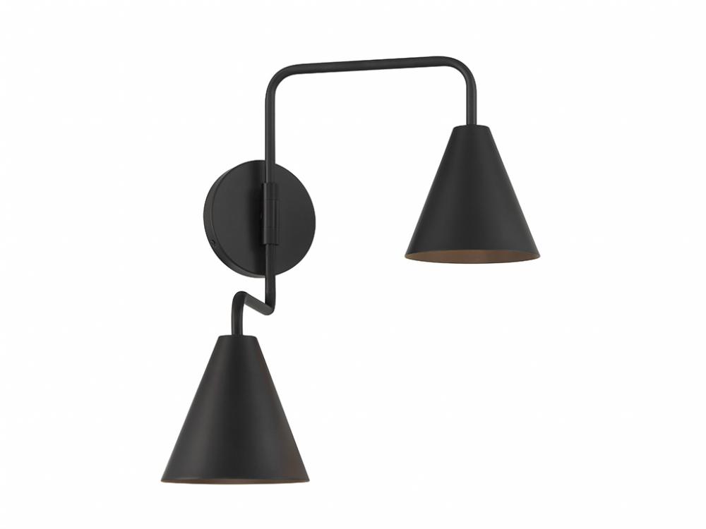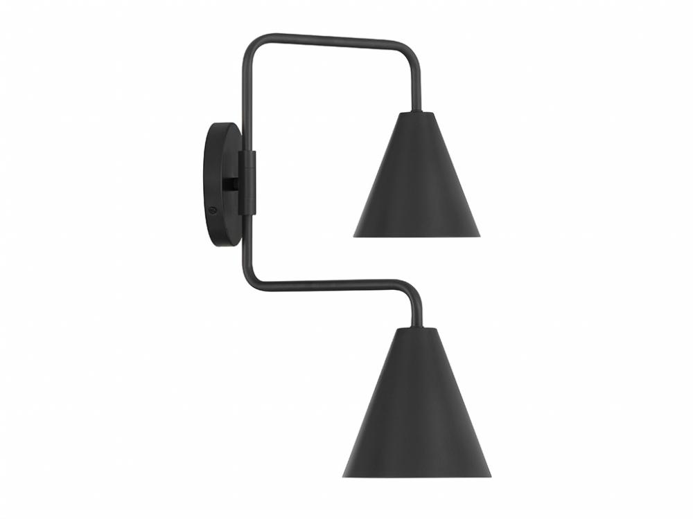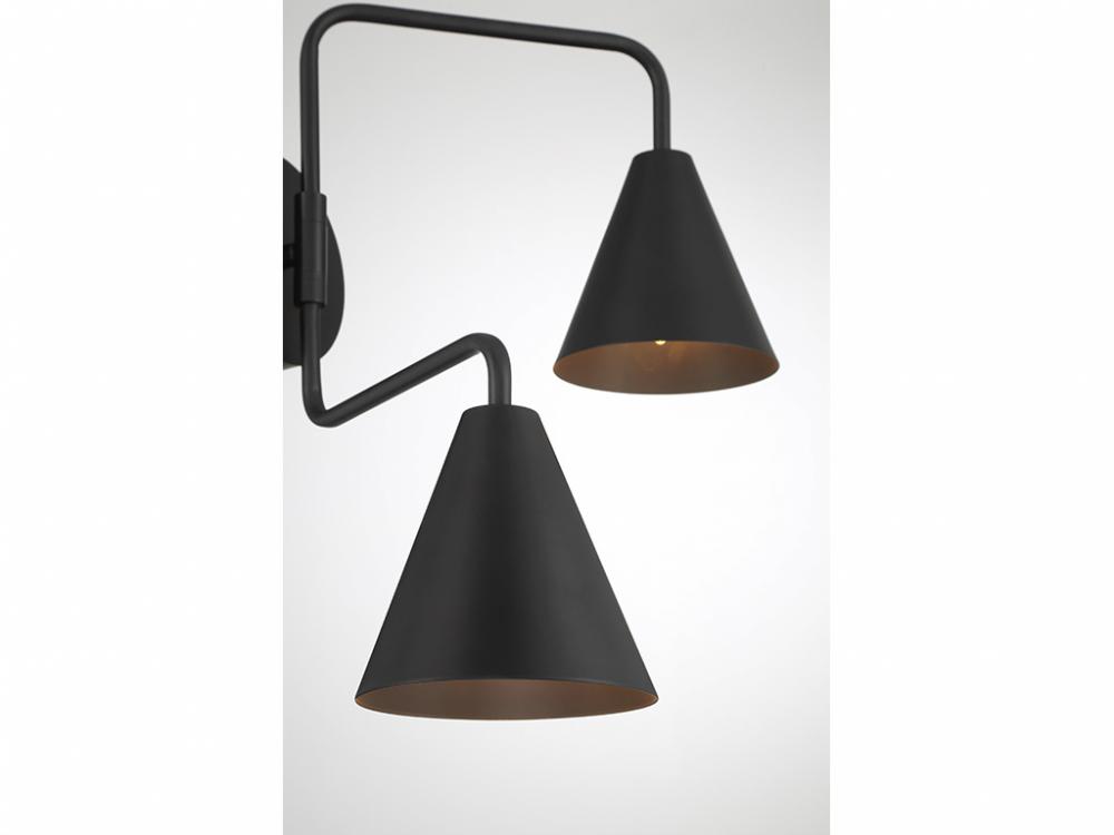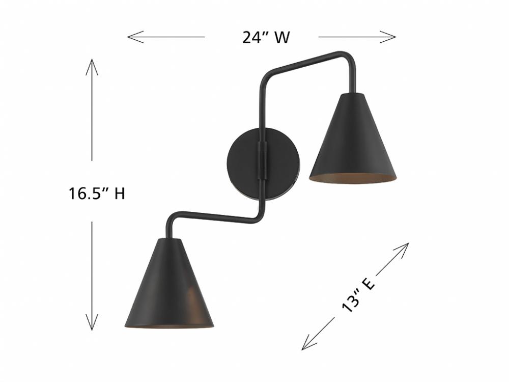 The boldly angled arms and shining Matte Black finish of this 2-light adjustable wall sconce combine to make it a true conversation piece. Customize it by adjusting the arms as needed! The shades are opaque, so they will concentrate and direct the light. The sconce is 16.5" in height, 24" in width and extends 13" from the wall. It uses 2 candelabra size bulbs of up to 60 watts per bulb. Bulbs not included.