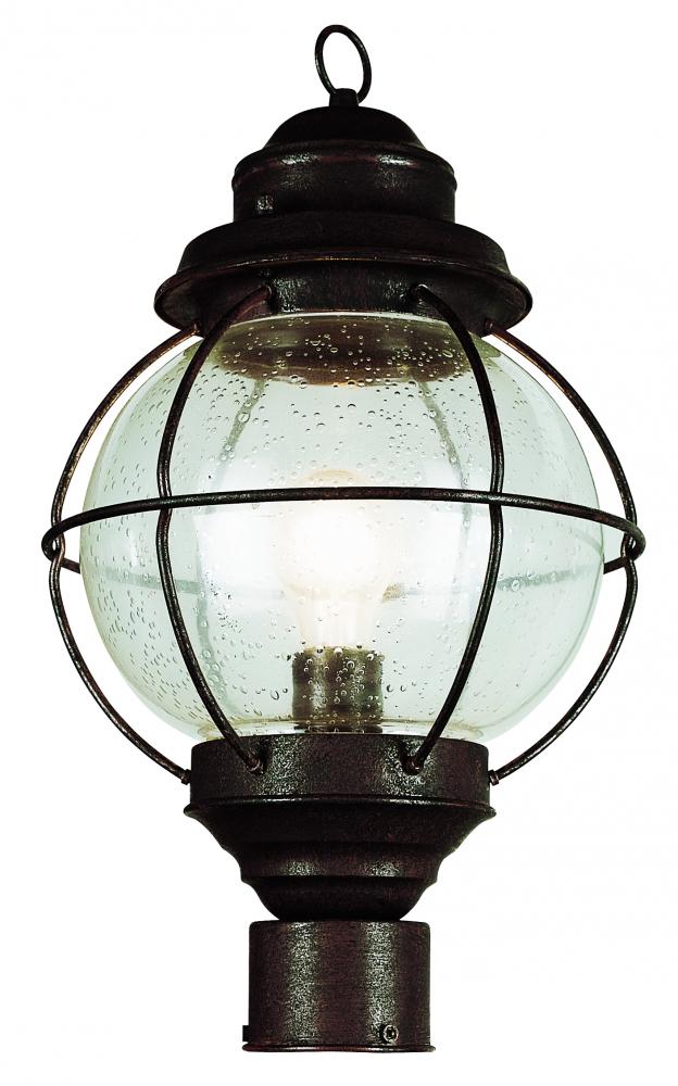 The Catalina 19" Postmount Lantern adds charming character to your home’s exterior. The Catalina Collection sets a warm and inviting tone for an outdoor living area while providing ample lighting. A round clear Seeded glass shade embodies classic styling of nautical lighting. The ring-hook and metal piping are details accenting this quality outdoor lantern.
