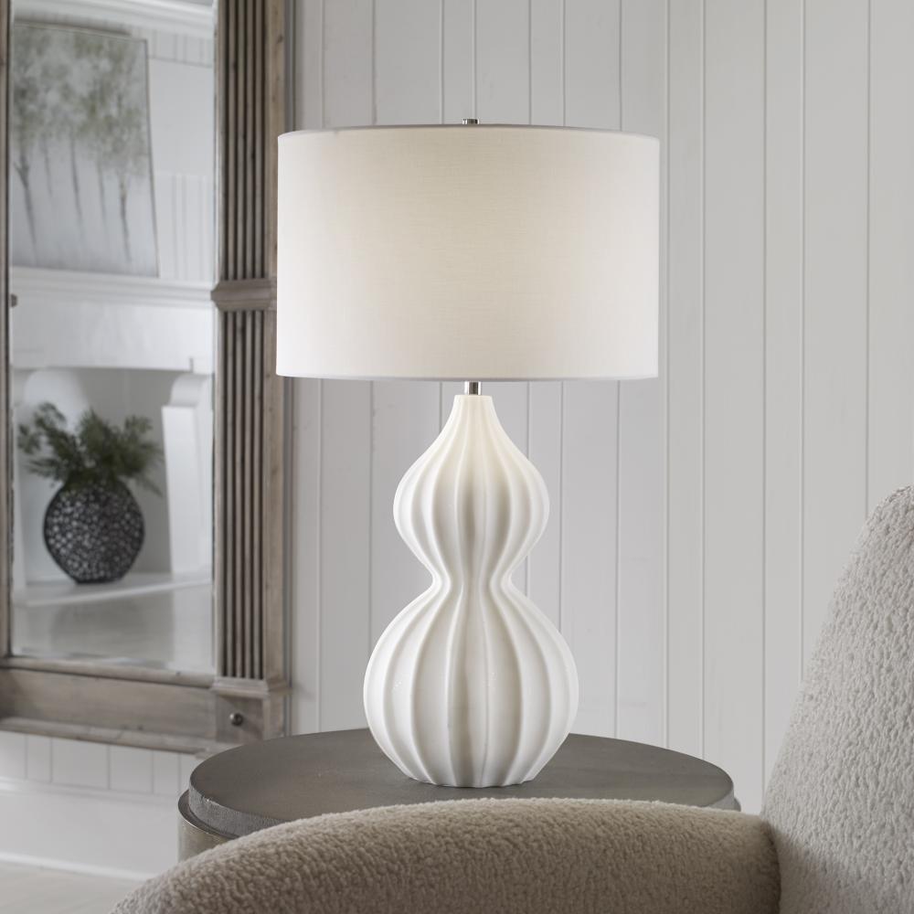 This Table Lamp is Executed in A Rich Ivory Man-made Stone That Accurately Replicates The Look of Thassos Marble Featuring Scalloped Ridges and Polished Nickel Accents. The Round Hardback Shade is Covered in A White Linen Fabric.