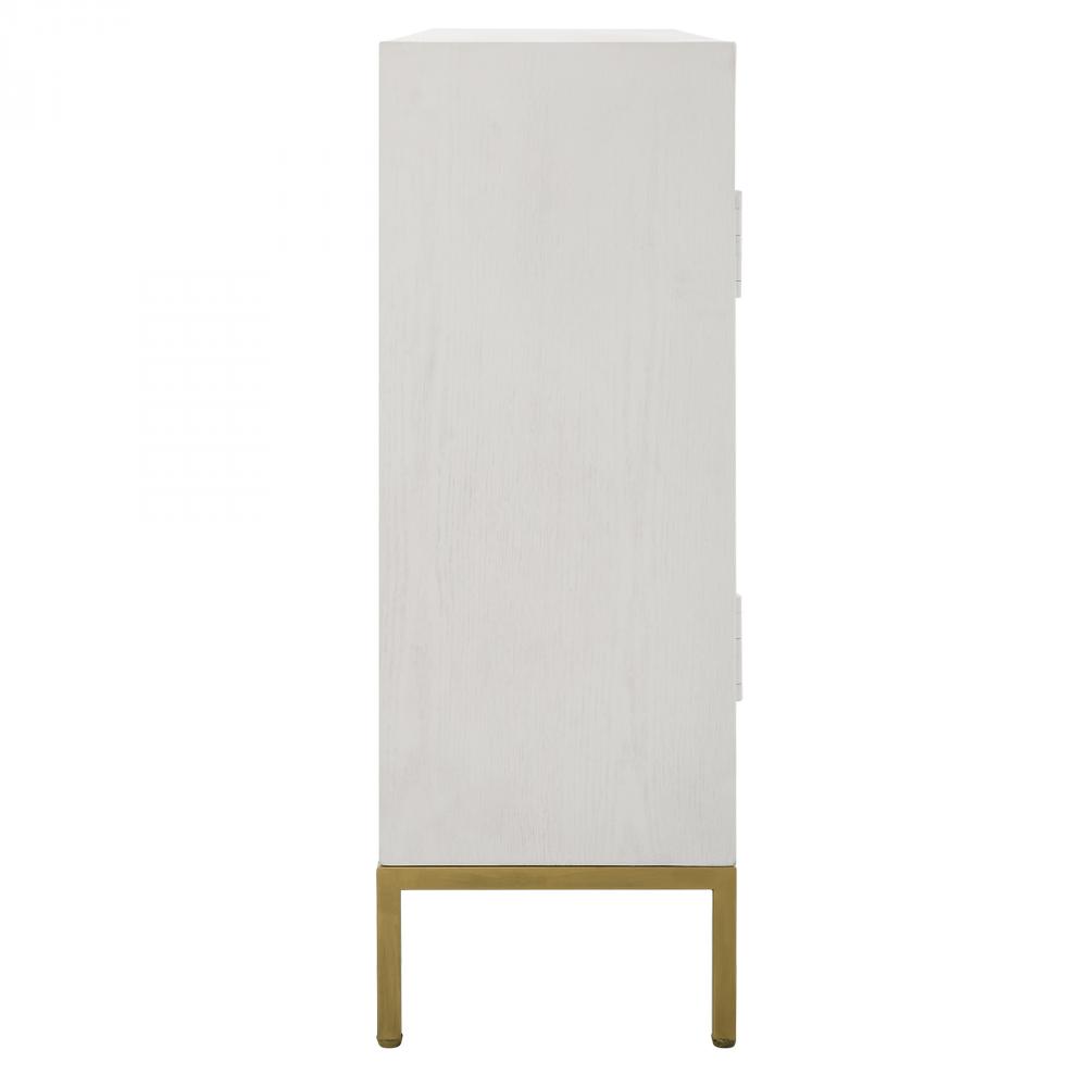 The Front Range Cabinet's Streamlined Design and Classic Finishes Make It A Perfect Addition to Virtually Any Space. The Exterior is Oak Veneer with A Painted White Finish, Accented with Aged Gold Iron. Has One Interior Fixed Shelf.