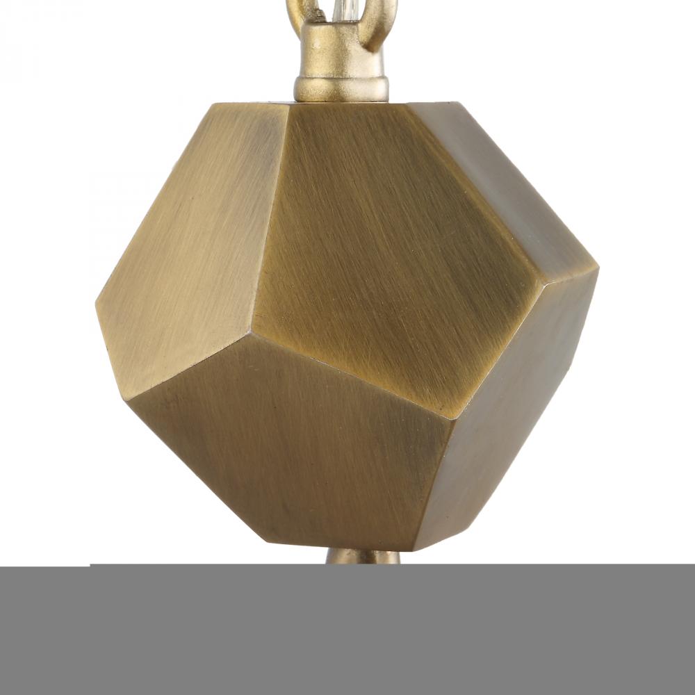 Three Sizes of Frosted Geometric Shaped Glass Give Us The Focal Point for This Celestial Feeling 3 Lt. Pendant. The Glass Sizes Are Small At 6", Medium At 7" and Large At 8" Each Suspended From A Preset Rod Length Accented with A Rich Matte Antique Brass Finish. 3-60 Watt Max Candelabra Sockets. Bulbs Not Included. Supplied with 12' Wire, 5' Chain for Adjustable Installation.