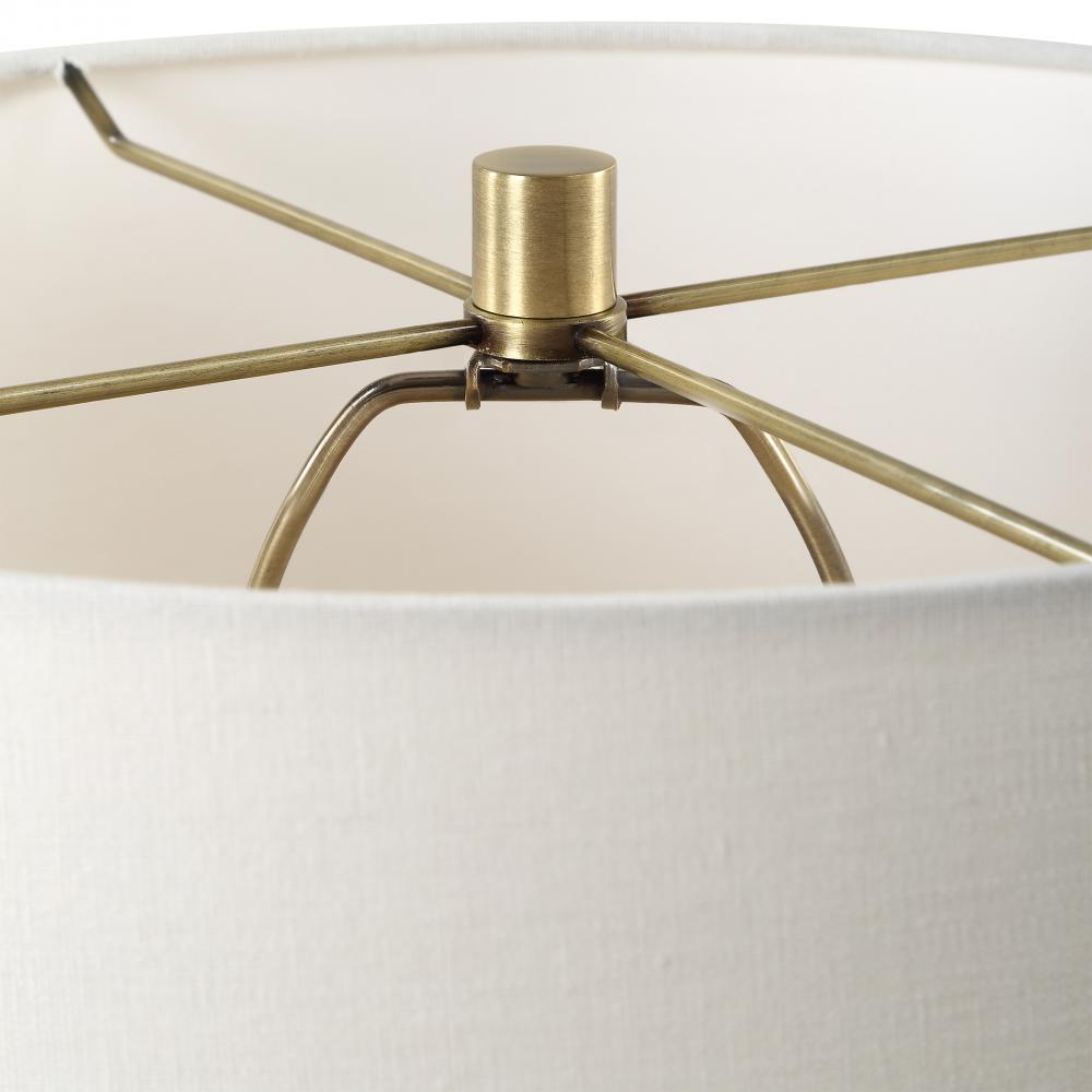 Crafted From White Marble With Subtle Veining, This Table Lamp Is Displayed On A Thick Crystal Foot, Complemented By Plated Antique Brass Accents. A Slightly Tapered Hardback Shade In A Crisp White Linen Fabric Complements The Piece.