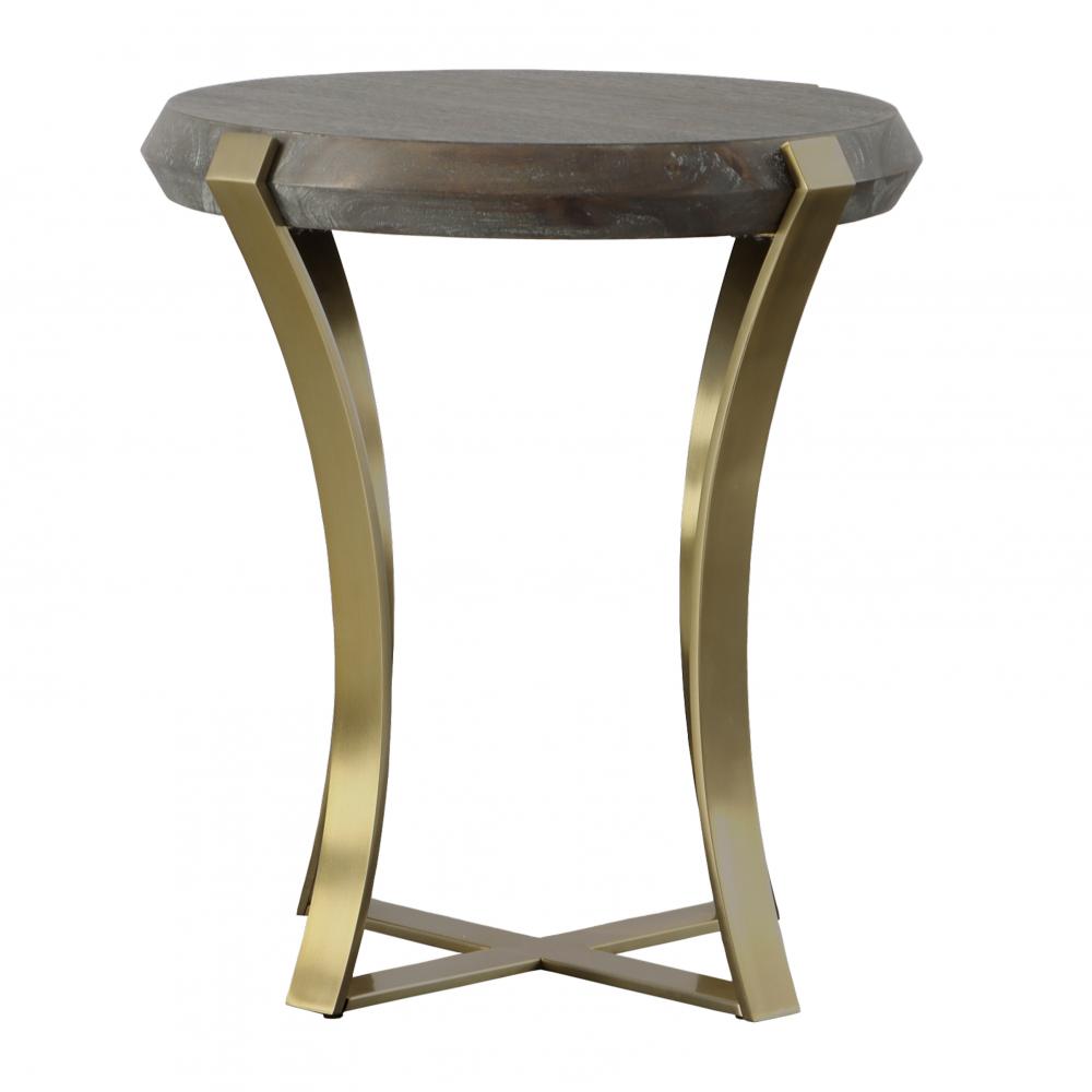 Plated Brushed Brass Legs Suspend The Top of The Unite Side Table in Acacia Veneer with A Dark Walnut Stain Washed with A Light Gray Glaze.