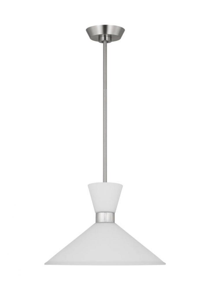 Inspired by playful mid-century modern design, the Drew & Jonathan Belcarra Medium Pendant is accentuated by a flared glass shade with ribbed metal details and etched white glass that bestows an almost whimsical touch to the clean design. Available in three finishes, Brushed Steel, Midnight Black, and Satin Brass, the Belcarra looks great on its own or when grouped in multiples. This product may be mounted on a sloped ceiling and is cETL listed for damp locations, making it the perfect lighting solution for any space.