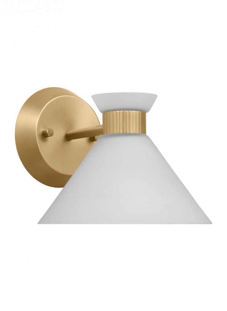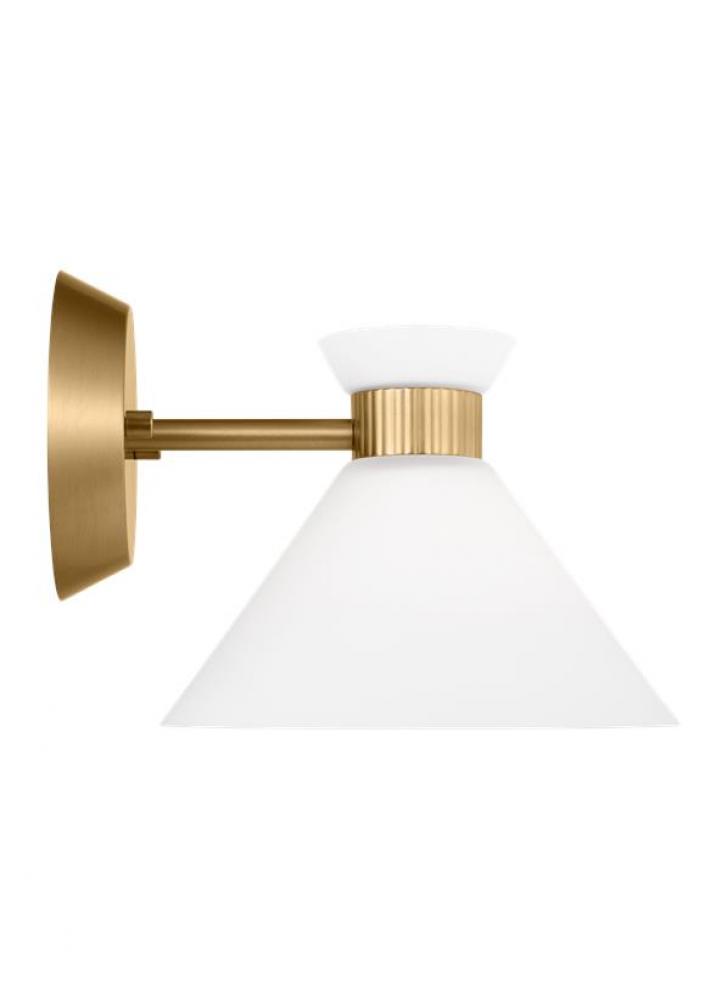 The flared glass shade with ribbed metal details and etched white glass of this light bring clean lines and classic mid-century modern design to any wall or bath space