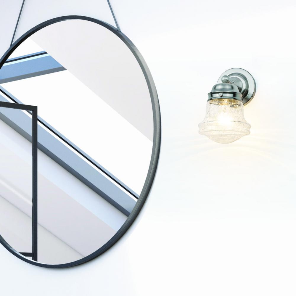 Low-key and tasteful, this one-light wall sconce from the Vaughn collection lifts the mood in a casual space with a charming village-inspired theme. Blending nautical with industrial, this sconce features a clear seedy glass shade in a unique schoolhouse shape, nestled to a cool brushed nickel finish steel frame with a dimensional round wall mount and holder and an extra accent piece.