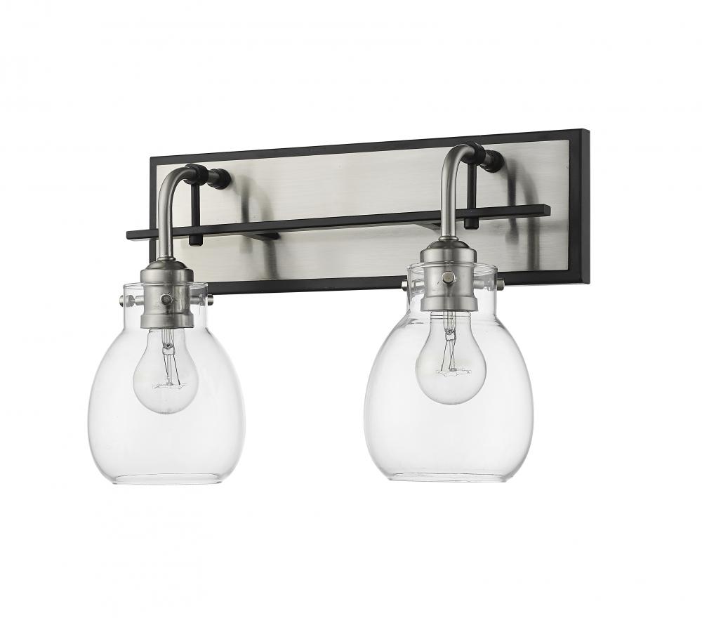 Charmingly bright, this two-light wall sconce features a clear glass shade. Full of curves and sleek lines, matte black and brushed nickel combine to create a stunning visual.