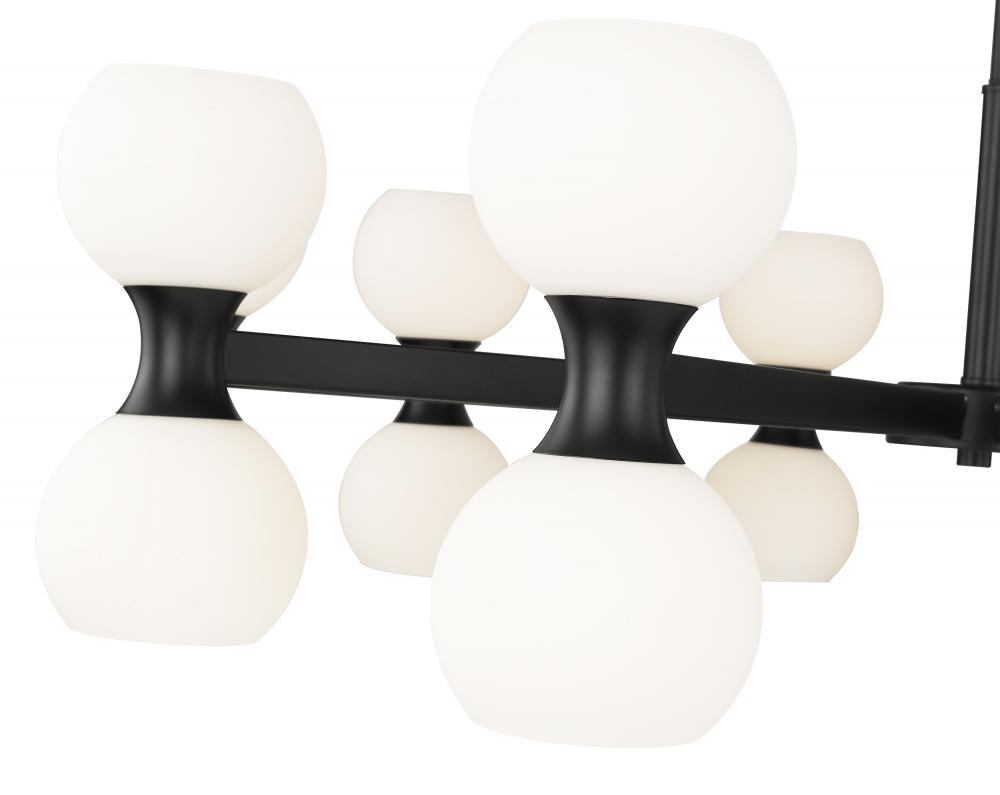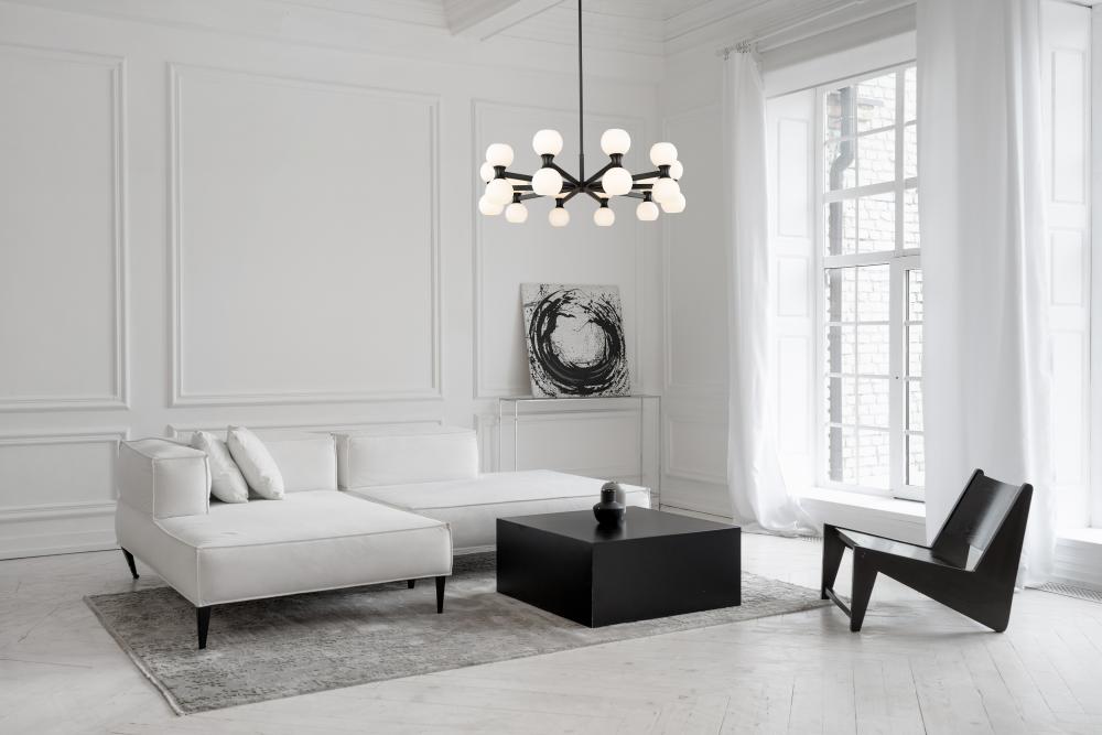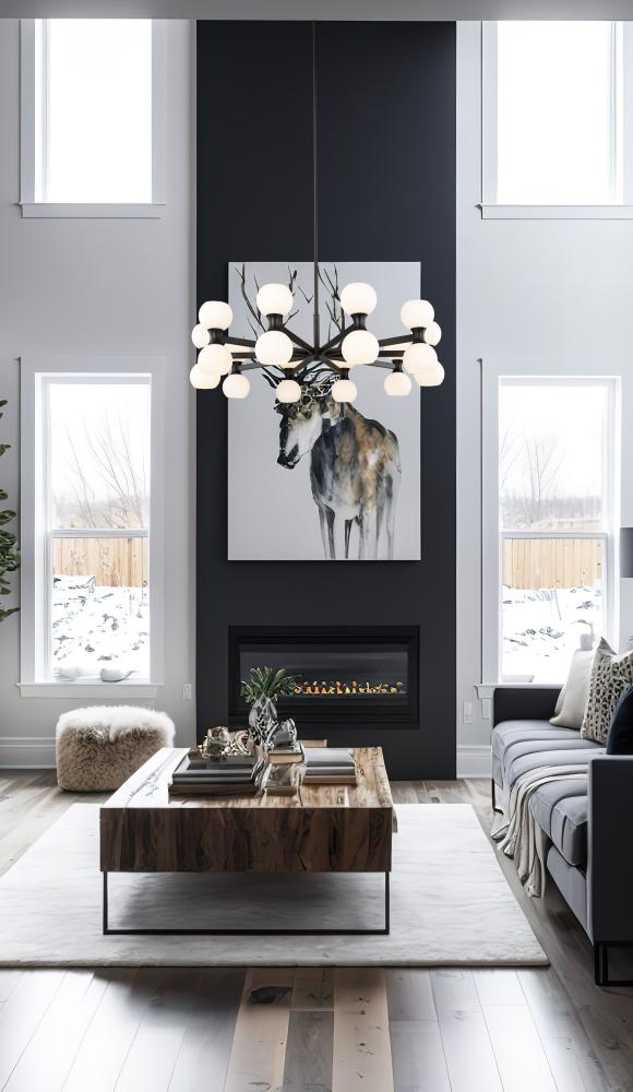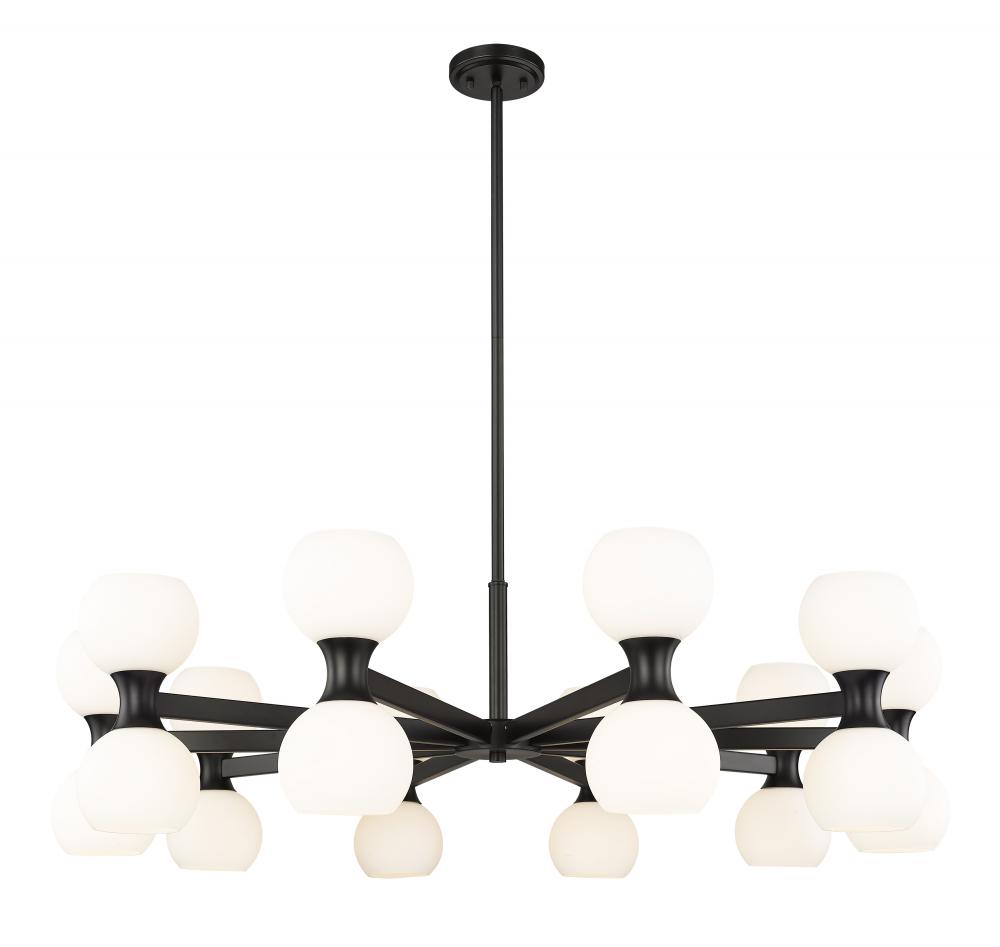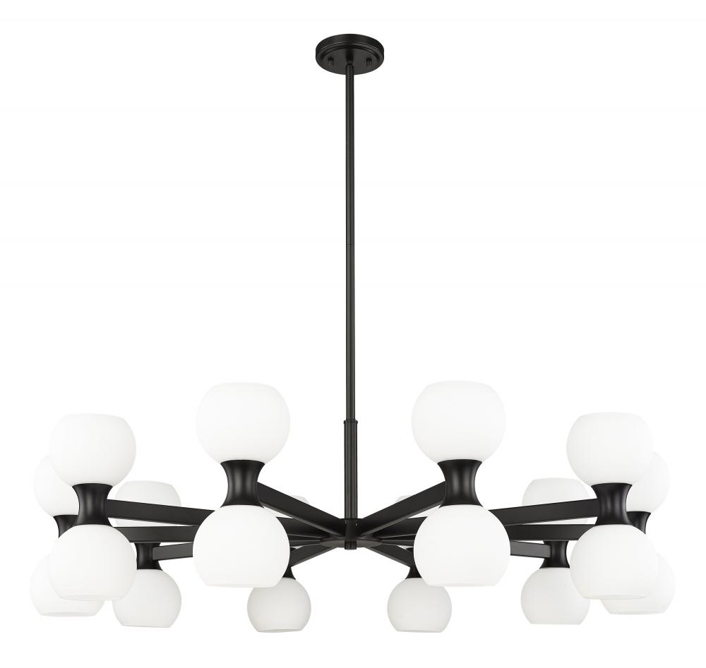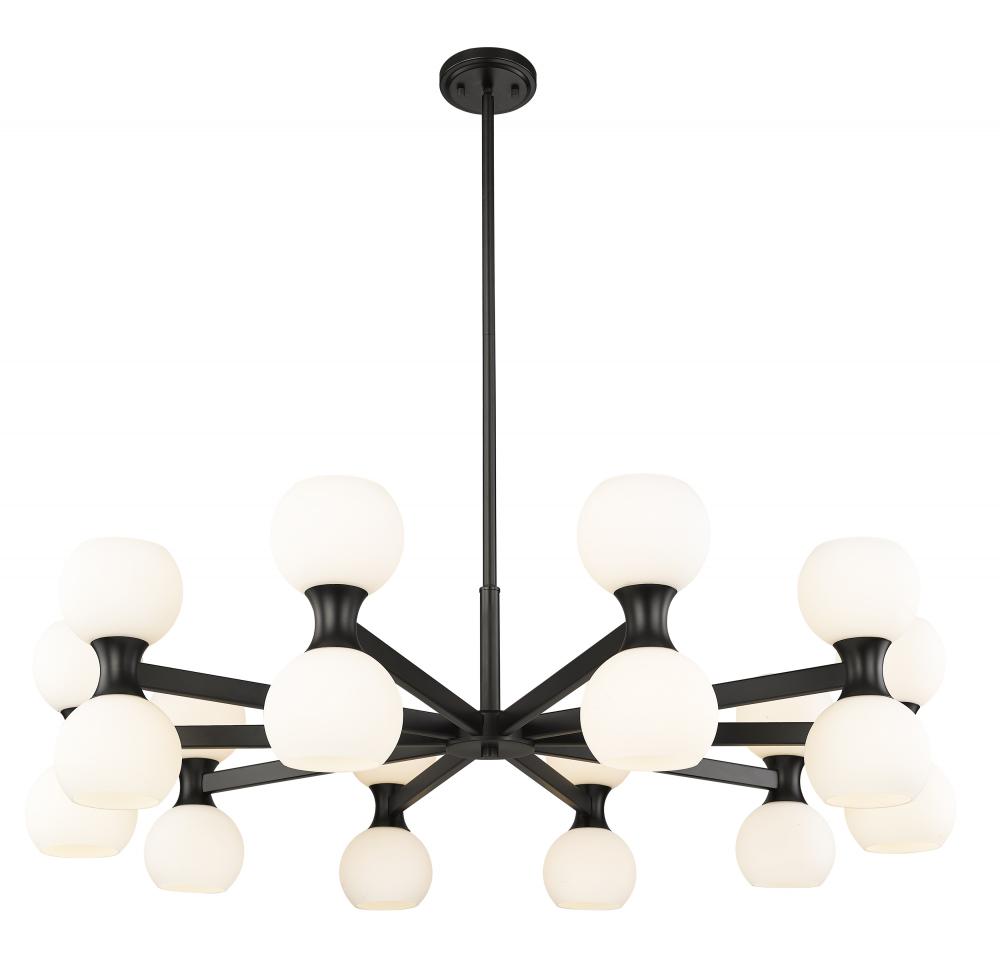 Striking finish contrasts embellish the festive look of a light fixture with endless personality and timeless style. Choose this Mid-Century Modern 20-light chandelier from the Artemis collection to make a signature design statement in a spacious living area in need of strong ambient lighting. Delicate matte opal glass shades attach to a linear matte black finish steel frame, dressed up with alluring curved elements and packaged to provide both fashion and function.