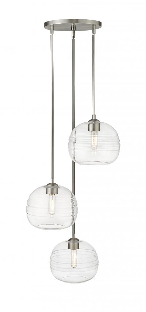 Express your modern aesthetic with this eye-catching three-light pendant. Grooved, rounded shades are made from clear glass, suspended from a sleek steel frame with a brushed nickel finish. The fixture brings a chic cutting edge to a contemporary kitchen or dining room.