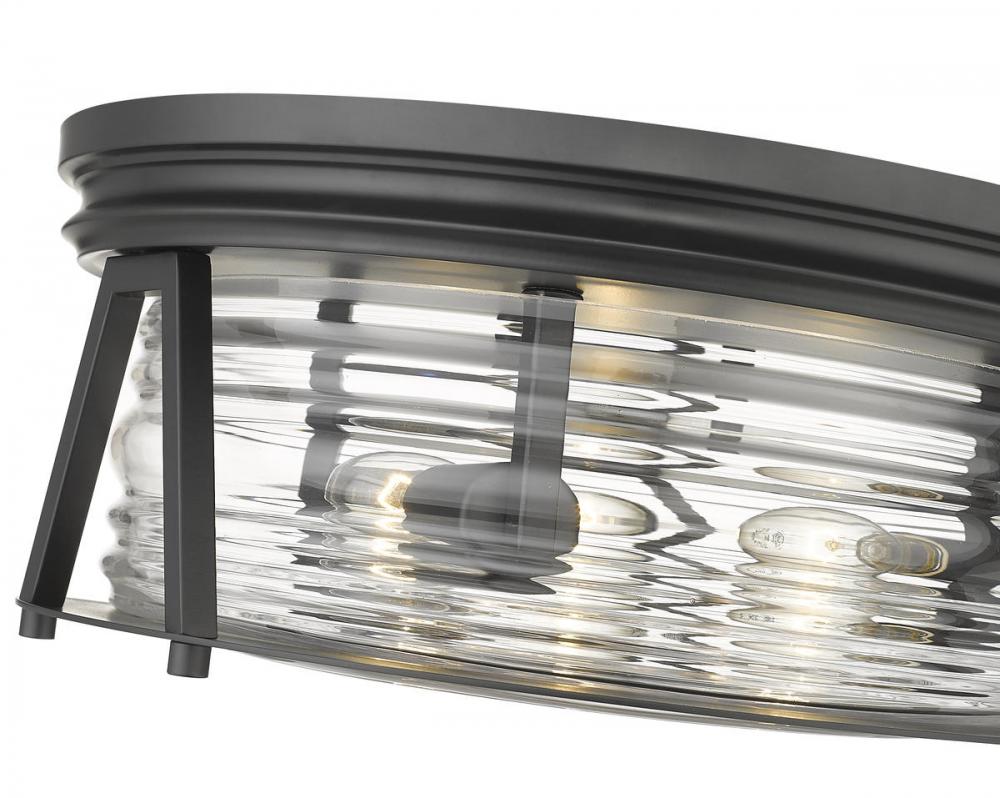 Chic lighting illuminates a custom space with decadence and a hint of nautical fare, customizing this matte black and glass three-light flushmount ceiling light. Embrace a historical theme originating from storied lighthouse designs with this light from the Cape Harbor collection, enjoying versatility that embellishes a space with modern, industrial, and Art Deco ambiance. This light offers a sleek ribbed clear glass shade nestled in a linear frame fashioned of bold matte black finish steel.