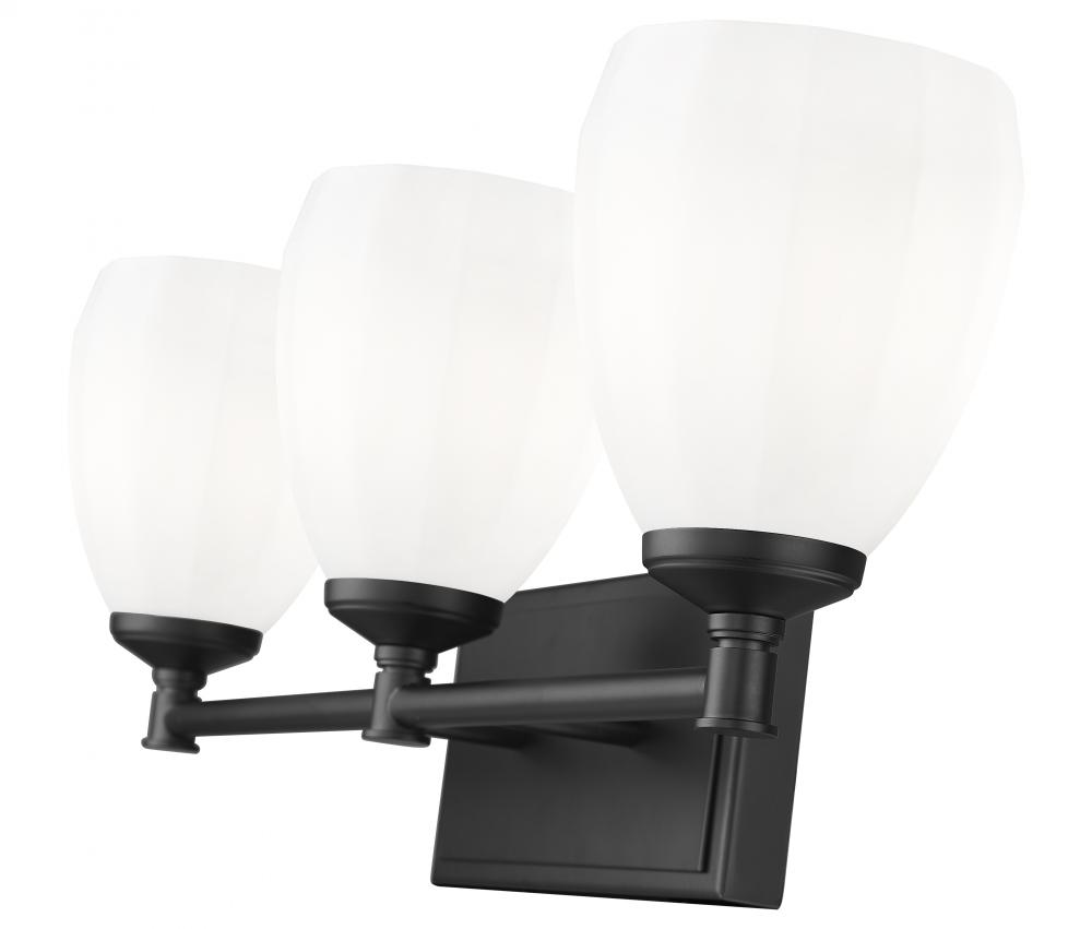 Capture the richness of clean, simple lines paired with elegant finishes on this modern three-light vanity wall light. In matte black, it adds bold contrast against most walls, ensuring eye-catching character. Three lights are surrounded with matte opal glass, casting bright, diffused illumination perfect for grooming and beauty tasks or ambiance.