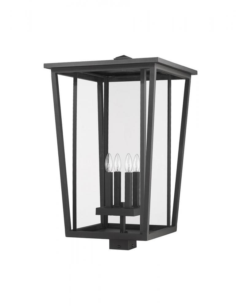 Angled sections merge to create an optically pleasing energy, adding a striking look to this four-light outdoor post-mount fixture. Top a post of your choice with this elegant hybrid traditional and modern fixture crafted of black finish aluminum with cool slanted features. Specially cut clear glass panels finish its tasteful design.